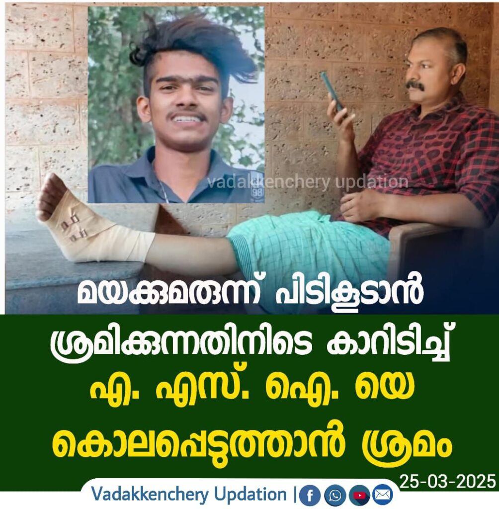 വടക്കഞ്ചേരി;മയക്കുമരുന്ന് പിടികൂടാൻ ശ്രമിക്കുന്നതിനിടെ കാറിടിച്ച് എ. എസ്. ഐ. യെ കൊലപ്പെടുത്താൻ ശ്രമം. വടക്കഞ്ചേരി സ്റ്റേഷനിലെ ഗ്രേഡ് എ എസ് ഐ പത്തനാപുരം സ്വദേശി ഉവൈസ് (46) നെയാണ് കാറിടിച്ച് കൊലപ്പെടുത്താൻ ശ്രമിച്ചത്. ഇന്നലെ രാത്രി എട്ട് മണിയോടുകൂടി ദേശീയപാത ചെമ്മണാംകുന്നിന് സമീപമാണ് സംഭവം നടന്നത്.