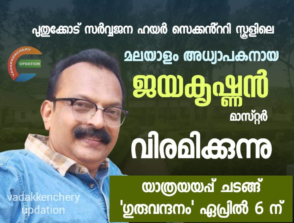 പാലക്കാട് ജില്ലയിലെ പുതുക്കോട് സർവ്വജന ഹയർ സെക്കൻ്ററി സ്കൂളിലെ സീനിയര് മലയാളം അധ്യാപകനായ ജയകൃഷ്ണന് മാസ്റ്റര് 2025 അധ്യയന വര്ഷം ഔദ്യോഗിക ജീവിതത്തില് നിന്ന് വിരമിക്കുകയാണ്.