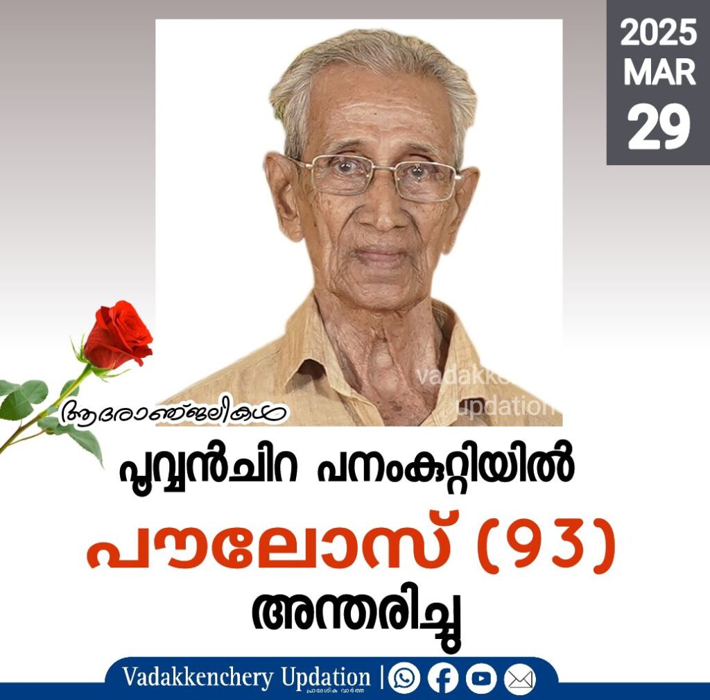 പൂവ്വൻചിറ പനംകുറ്റിയിൽ മത്തായി മകൻ പൗലോസ് (93) അന്തരിച്ചു. സംസ്കാരം നാളെ(30/03/2025 ഞായറാഴ്ച) വൈകിട്ട് 3.30ന് ചുവന്നമണ്ണ് സെന്റ് ജോർജ്ജ് ഓർത്തഡോക്സ് പള്ളിയിൽ.