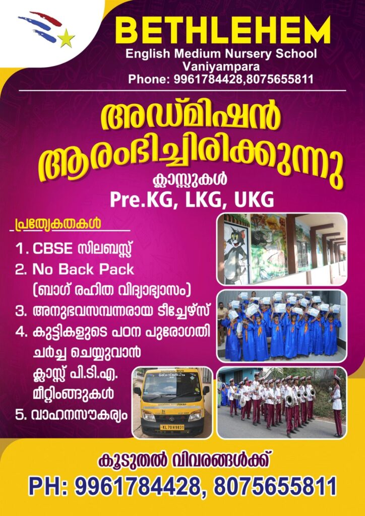 വാണിയംപാറ ബെത്ലഹേം ഇംഗ്ലീഷ് മീഡിയം നഴ്സറി സ്കൂളിൽ 2025 – 2026 Pre.KG, LKG, UKG ക്ലാസുകളിലേക്ക് അഡ്മിഷൻ ആരംഭിച്ചിരിക്കുന്നു. അഡ്മിഷനുമായ വിവരങ്ങൾക്ക് താഴെ കാണുന്ന നമ്പറിൽ ബന്ധപ്പെടുക