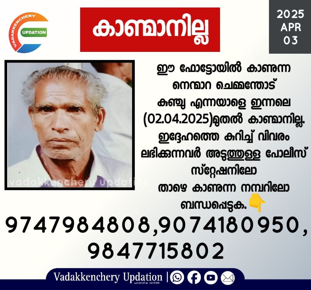 ഈ ഫോട്ടോയിൽ കാണുന്ന നെന്മാറ ചെമ്മന്തോട് കുഞ്ചു എന്നയാളെ ഇന്നലെ (02.04.2025)മുതൽ കാണ്മാനില്ല. ഇദ്ദേഹത്തെ കുറിച്ച് വിവരം ലഭിക്കുന്നവർ അടുത്തുള്ള പോലീസ് സ്റ്റേഷനിലോ