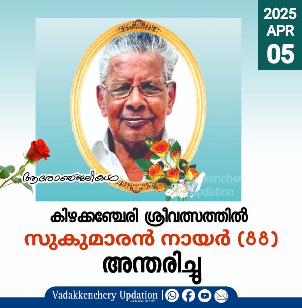 കിഴക്കഞ്ചേരി ശ്രീവത്സത്തിൽ സുകുമാരൻ നായർ (88 )(തോലന്നൂർ പടിഞ്ഞാറേ കോലത്ത് വീട്) അന്തരിച്ചു. സംസ്കാരം നാളെ (ഞായറാഴ്ച 06-04-2025 ) പകൽ 9ന് തിരുവില്വാമല ഐവർമoത്തിൽ.