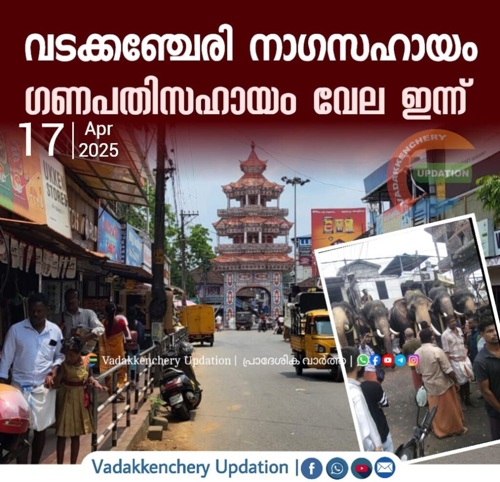 വടക്കഞ്ചേരി വേല ഇന്ന് ആഘോഷിക്കും. ഇരുക്ഷേത്രങ്ങളിലും ബുധനാഴ്ച വൈകീട്ട് ആനച്ചമയ പ്രദർശനവും പഞ്ചാരിമേളവും നടന്നു. വ്യാഴാഴ്ച പറയെടുപ്പ്, ഈടുവെടി, കേളി എന്നിവയ്ക്കുശേഷം പഞ്ചവാദ്യത്തിന്റെ അകമ്പടിയോടെ അഞ്ചാനകൾ അണിനിരക്കുന്ന എഴുന്നള്ളത്ത് തുടങ്ങും. നാഗസഹായം എഴുന്നള്ളത്തിന് പാമ്പാടി രാജൻ തിടമ്പേറ്റും. ചോറ്റാനിക്കര വിജയൻമാരാർ പഞ്ചവാദ്യത്തിന് നേതൃത്വംനൽകും.