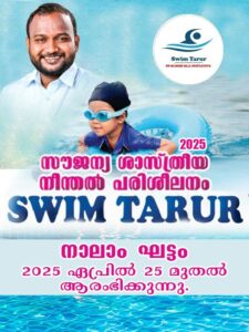 തരൂർ നിയോജക മണ്ഡലത്തിലെ സ്വിം തരൂർ സൗജന്യ ശാസ്ത്രീയ നീന്തൽ പരിശീലന പദ്ധതിയുടെ നാലാം ഘട്ടം 2025 ഏപ്രിൽ 25 തീയതി മുതൽ തരൂർ നിയോജകമണ്ഡലത്തിലെ വിവിധ കേന്ദ്രങ്ങളിൽ ആരംഭിക്കുന്നു. മണ്ഡലത്തിലെ വിവിധ കേന്ദ്രങ്ങളിലായി സ്കൂൾ കുട്ടികളും PSC ഉദ്യോഗാർത്ഥികളും ഉൾപ്പടെ 827 പേരെ പദ്ധതിയിലൂടെ ജല സുരക്ഷയിൽ പ്രാപ്തരാക്കാൻ കഴിഞ്ഞു 7 വയസ്സ് മുതൽ 13 വയസ്സ് വരെയുള്ള താല്പര്യമുള്ള കുട്ടികൾക്ക് താഴെ കാണുന്ന ലിങ്ക് വഴി ജോയിൻ ചെയ്യാവുന്നതാണ്.