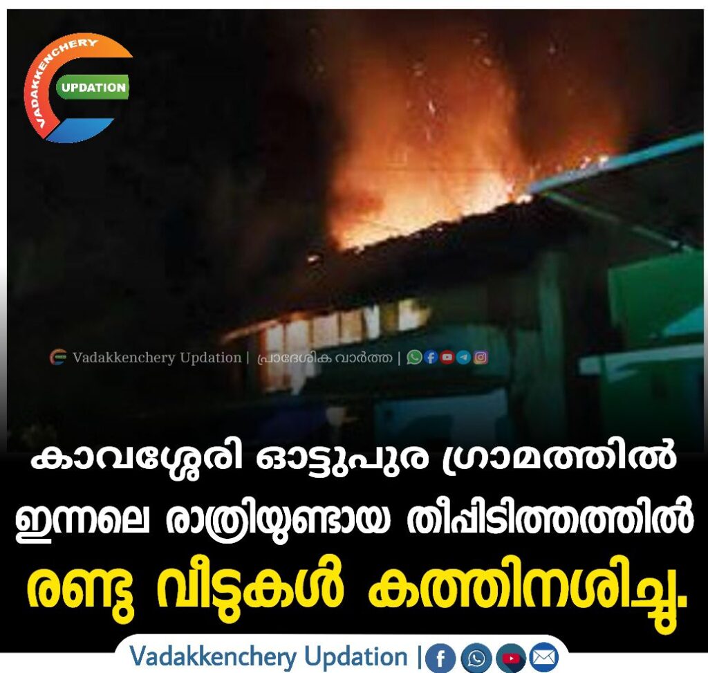 ആലത്തൂർ കാവശ്ശേരി ഓട്ടുപുര ഗ്രാമത്തിൽ തിങ്കളാഴ്ച രാത്രിയുണ്ടായ തീപ്പിടിത്തത്തിൽ രണ്ടു വീടുകൾ കത്തിനശിച്ചു. റിട്ട. പോലീസ് ഉദ്യോഗസ്ഥൻ പരേതനായ രാമൻ, റിട്ട. അധ്യാപകനും എഴുത്തുകാരനുമായ എൻ.എം. നൂലേലി എന്നിവരുടെ വീടുകൾക്കാണ് തീ പിടിച്ചത്. രാത്രി പതിനൊന്നോടെ രാമന്റെ വീട്ടിലാണ് ആദ്യം തീ പടർന്നത്. ഇദ്ദേഹത്തിന്റെ ഭാര്യ വിജയലക്ഷ്മി മാത്രമാണ് ഈ സമയം വീട്ടിലുണ്ടായിരുന്നത്. ഇവർ പുറത്തേയ്ക്ക് ഓടിരക്ഷപ്പെട്ടു. നൂലേലിയും കുടുംബവും ഈ സമയം മകന്റെ വീട്ടിലായിരുന്നു.
