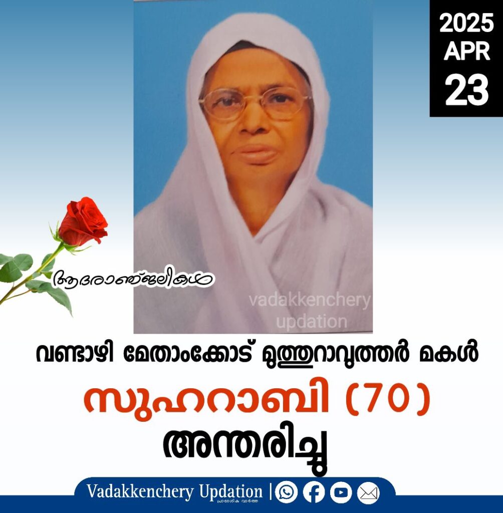 വണ്ടാഴി മേതാംക്കോട് മുത്തുറാവുത്തർ മകൾ സുഹറാബി (70) അന്തരിച്ചു. സംസ്കാരം ഇന്ന് (23.04.25 ബുധൻ) വൈകീട്ട് 5:30 ന് വണ്ടാഴി പുത്തൻപള്ളി ജുമാമസ്ജിദിൽ.