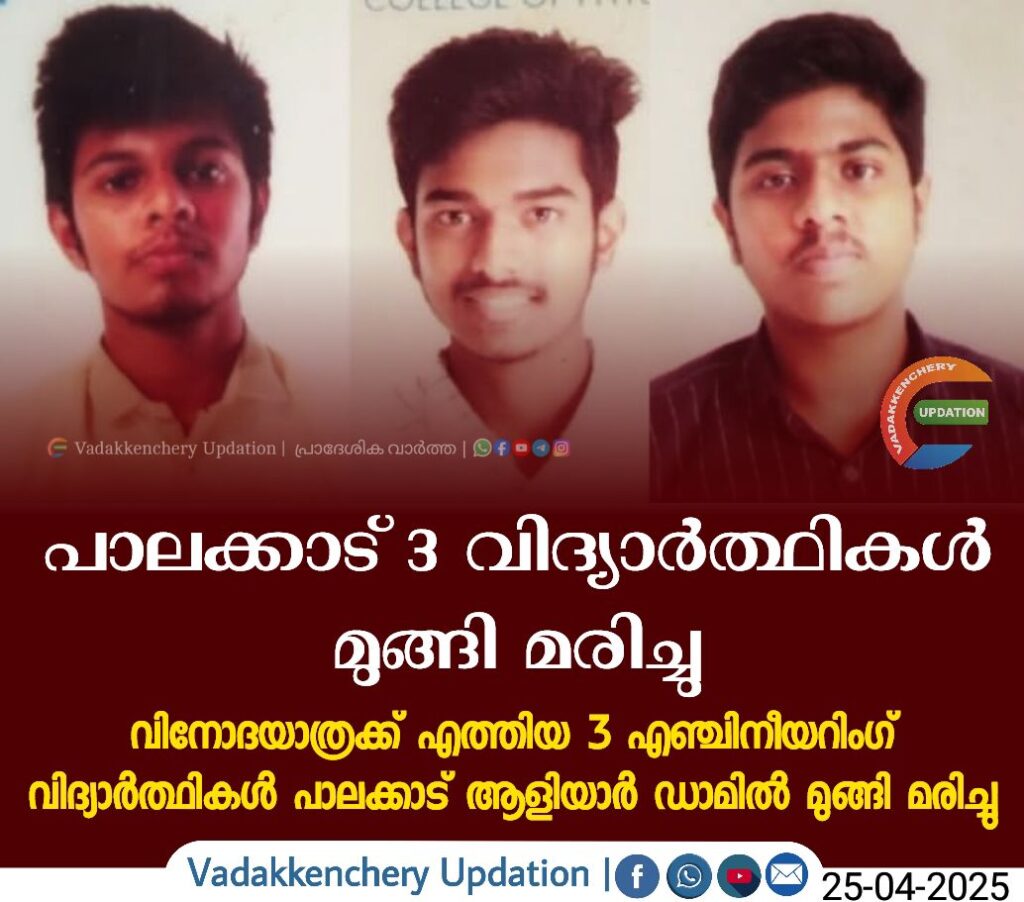 പാലക്കാട് ആളിയാർ ഡാമിലാണ് 3 വിദ്യാർത്ഥികൾ മുങ്ങി മരിച്ചത്. ഡാമിൽ കുളിക്കുമ്പോഴാണ് അപകടം ഉണ്ടായത്. മരിച്ചത് എഞ്ചിനീയറിംഗ് വിദ്യാർത്ഥികൾ. സംഘം എത്തിയത് വിനോദയാത്രക്ക്.