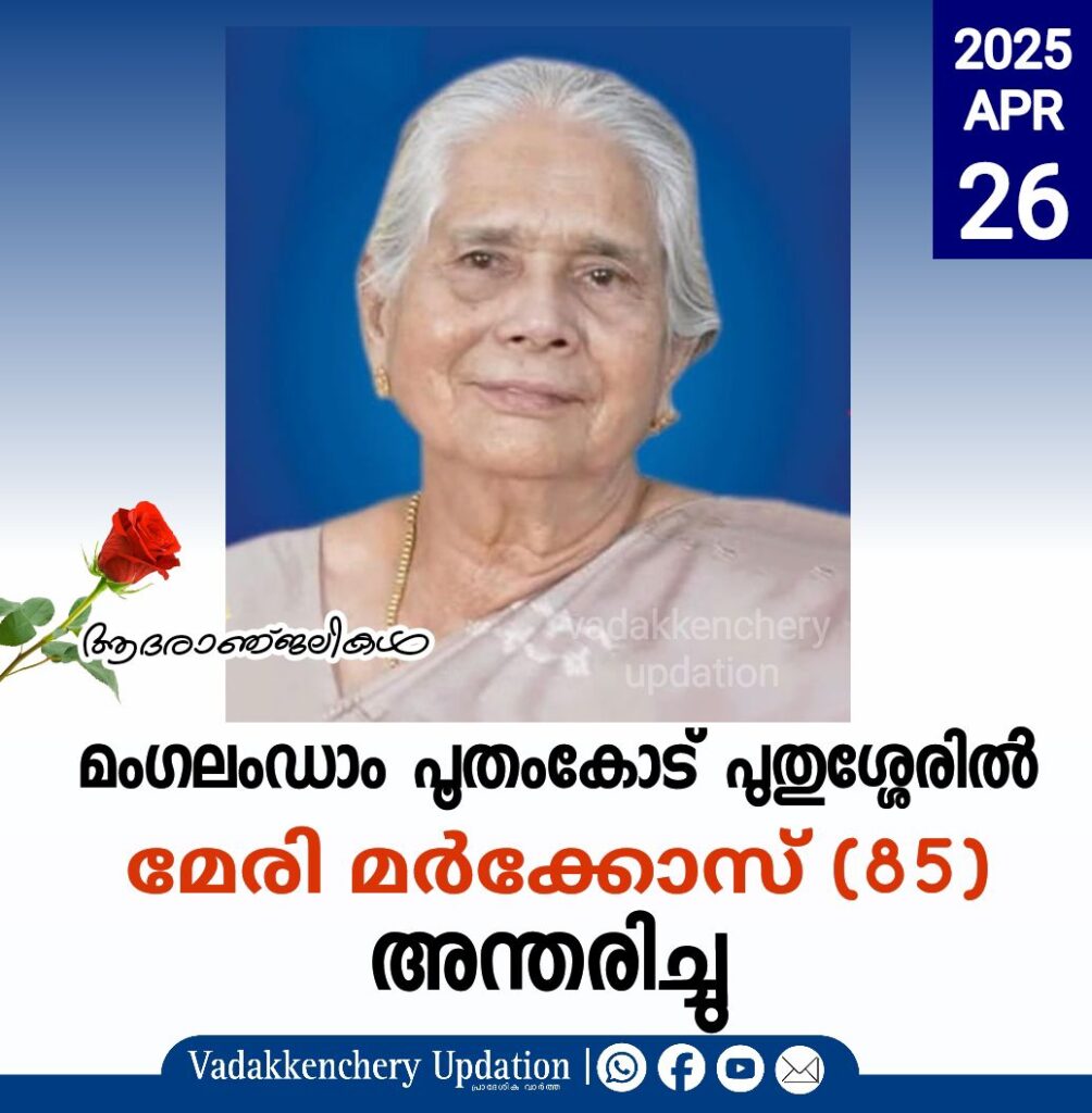 മംഗലംഡാം പൂതംകോട് പുതുശ്ശേരിൽ മേരി മർക്കോസ് (85) അന്തരിച്ചു.സംസ്കാരം ഇന്ന് (26-04-2025) വൈകുന്നേരം 3:00 ക്ക് മംഗലം ഡാം സെ.മേരീസ് യാക്കോബായ സുറിയാനി പള്ളിയിൽ