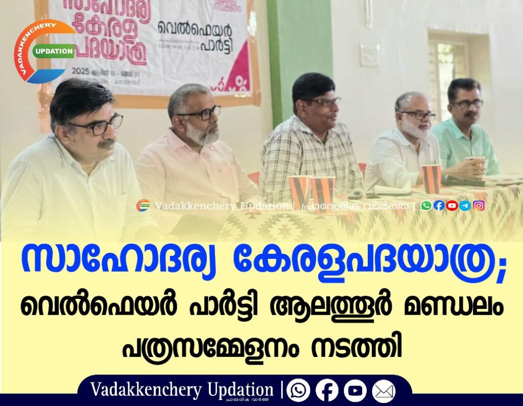 കേരളത്തിന്റെ നവോത്ഥാന ചരിത്രത്തെ ഓർമിപ്പിച്ചും നിലവിലെ രാഷ്ട്രീയ സാഹചര്യത്തെ ഗൗരവത്തിൽ ചർച്ച ചെയ്തുകൊണ്ടും നടത്തുന്ന സഹോദര്യ കേരള പദയാത്ര മെയ് 7 ബുധൻ 4 മണിക്ക് ടി ബി റോഡിൽ നിന്നും ദേശീയ പദയാത്രയും തുടർന്ന് പൊതുസമ്മേളനവും ആലത്തൂർ ദേശീയ മൈതാനത്തിൽ വച്ച് നടക്കുന്ന പശ്ചാത്തലത്തിൽ ആയിരുന്നു പത്രസമ്മേളനം അബൂഫൈസൽ മാസ്റ്റർ, ഷരീഫ് പള്ളത്ത് , ഹമീദ് എരുമയൂർ, മജീദ് മാസ്റ്റർ, സക്കീർ ഹുസൈൻ എന്നിവർ സംസാരിച്ചു