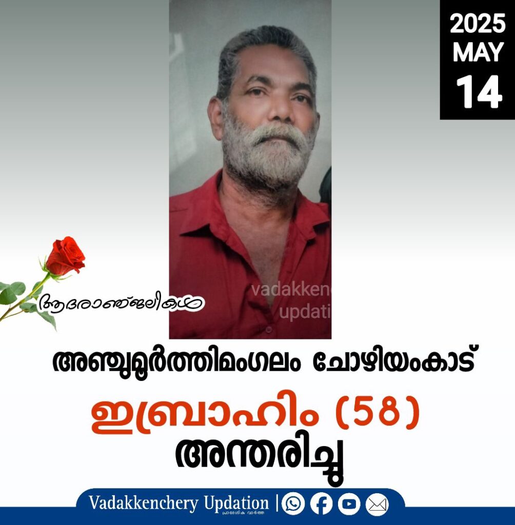 അഞ്ചുമൂർത്തിമംഗലം ചോഴിയംകാട് അസ്സനാർ മകൻ ഇബ്രാഹിം (58)അന്തരിച്ചു. സംസ്കാരം ഇന്ന് (14.05.2025 ബുധൻ) രാവിലെ 10 മണിക്ക് വടക്കഞ്ചേരി ഷാഫി ജുമാത് പള്ളിയിൽ .