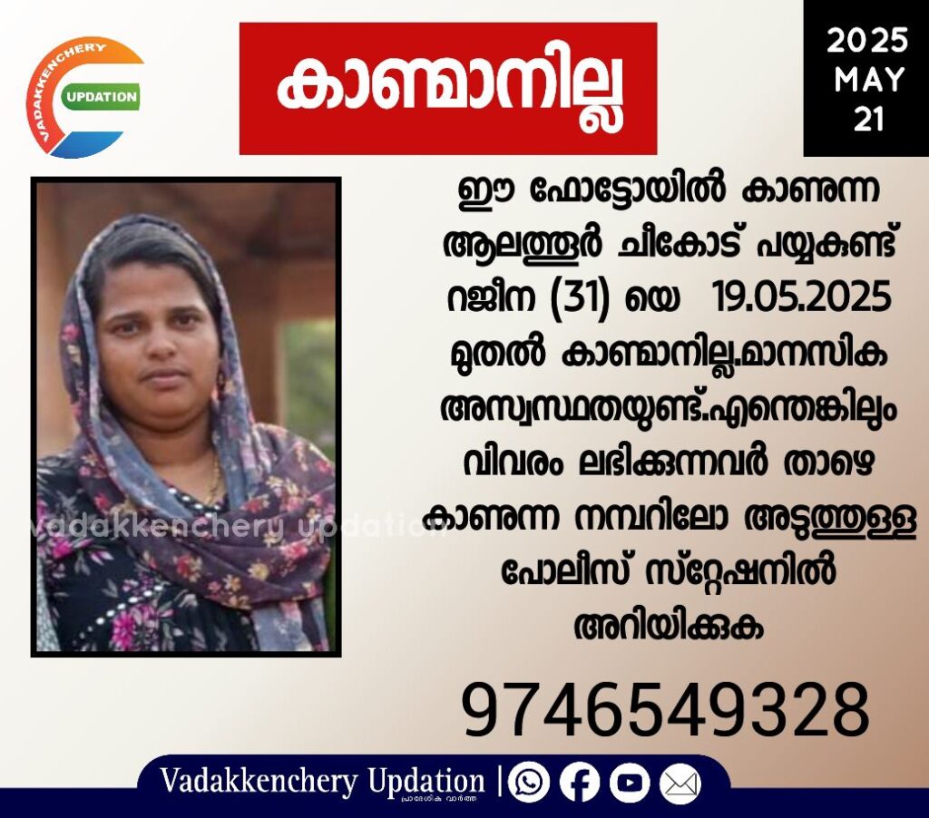 ഈ ഫോട്ടോയിൽ കാണുന്ന ആലത്തൂർ ചീകോട് പയ്യകുണ്ട് റജീന (31) യെ 19.05.2025 മുതൽ കാണ്മാനില്ല.മാനസിക അസ്വസ്ഥതയുണ്ട്.എന്തെങ്കിലും വിവരം ലഭിക്കുന്നവർ താഴെ കാണുന്ന നമ്പറിലോ അടുത്തുള്ള പോലീസ് സ്റ്റേഷനിൽ അറിയിക്കുക