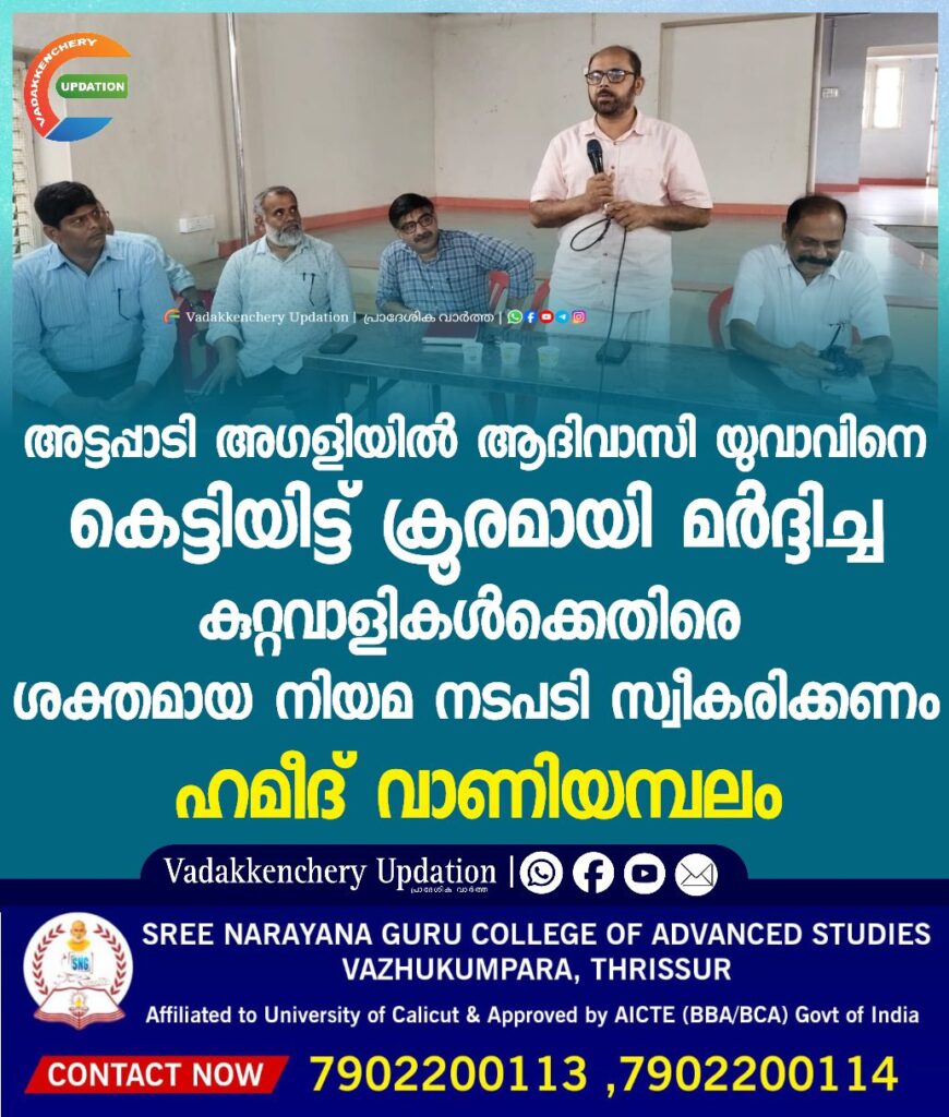 ആലത്തൂർ അഗളിയിൽ ഷിബു എന്ന ആദിവാസി യുവാവിനെ കെട്ടിയിട്ട് ക്രൂരമായി മർദ്ദിച്ച കുറ്റവാളികൾക്കെതിരെ ശക്തമായ നിയമ നടപടി സ്വീകരിക്കണമെന്ന് വെൽഫെയർ പാർട്ടി ദേശീയ വൈസ് പ്രസിഡൻ്റ് ഹമീദ് വാണിയമ്പലം പറഞ്ഞു. ആദിവാസികൾക്കെതിരെ നടക്കുന്ന കുറ്റകൃത്യങ്ങൾക്കെതിരെ ശക്തമായ നിയമനടപടി സ്വീകരിക്കാൻ സർക്കാരിനും പോലീസിനും പ്രത്യേകമായ ബാധ്യതയുണ്ട്. എന്നാൽ സർക്കാരും പോലീസും നിഷ്ക്രിയത്വം പുലർത്തുകയും പലപ്പോഴും കുറ്റവാളികളുടെ കൂടെ നിൽക്കുകയും ചെയ്യുന്നതു കൊണ്ടാണ് കുറ്റകൃത്യങ്ങൾ ആവർത്തിക്കുന്നത് എന്ന് അദ്ദേഹം പറഞ്ഞു. ആലത്തൂർ, തരൂർ മണ്ഡലങ്ങളിലെ വാർഡ്തല ഇലക്ഷൻ പ്രവർത്തനങ്ങളിൽ അവലോകനം ചെയ്ത് സംസാരിക്കുകയായിരുന്നു