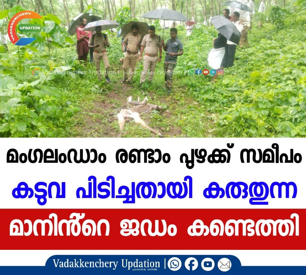 മംഗലം ഡാം രണ്ടാം പുഴക്ക് സമീപം കടുവ പിടിച്ചതായി കരുതുന്ന മാനിൻ്റെ ജഡം കണ്ടെത്തി. രണ്ടാംപുഴ വെറ്റിലത്തോട് സ്വകാര്യ തോട്ടത്തിലാണ് മാനിൻ്റെ അവശിഷ്ടങ്ങൾ കണ്ടെത്തിയത്. ബുധനാഴ്ച കാലത്ത് തോട്ടത്തിൽ ടാപ്പിങിന് പോയ തൊഴിലാളികളാണ് മാനിൻ്റെ അവശിഷ്ടങ്ങൾ കണ്ടത്. വിവരമറിയച്ചതിനെ തുടർന്ന് വനം വകുപ്പ് അധികൃതർ സ്ഥലത്തെത്തി പരിശോധന നടത്തി. കടുവയാണോ പുലിയാണോ ചെന്നായയാണോ മാനിനെ പിടിച്ചതെന്ന് പറയാൻ പാകത്തിനുള്ള തെളിവുകളൊന്നും പരിശോധനയിൽ ലഭിച്ചിട്ടില്ലെന്നും മേഖലയിൽ ക്യാമറകൾ സ്ഥാപിച്ച് നിരീക്ഷണം നടത്തി മേൽ നടപടികൾ സ്വീകരിക്കുമെന്നും വനം വകുപ്പ് അധികൃതർ അറിയിച്ചു.