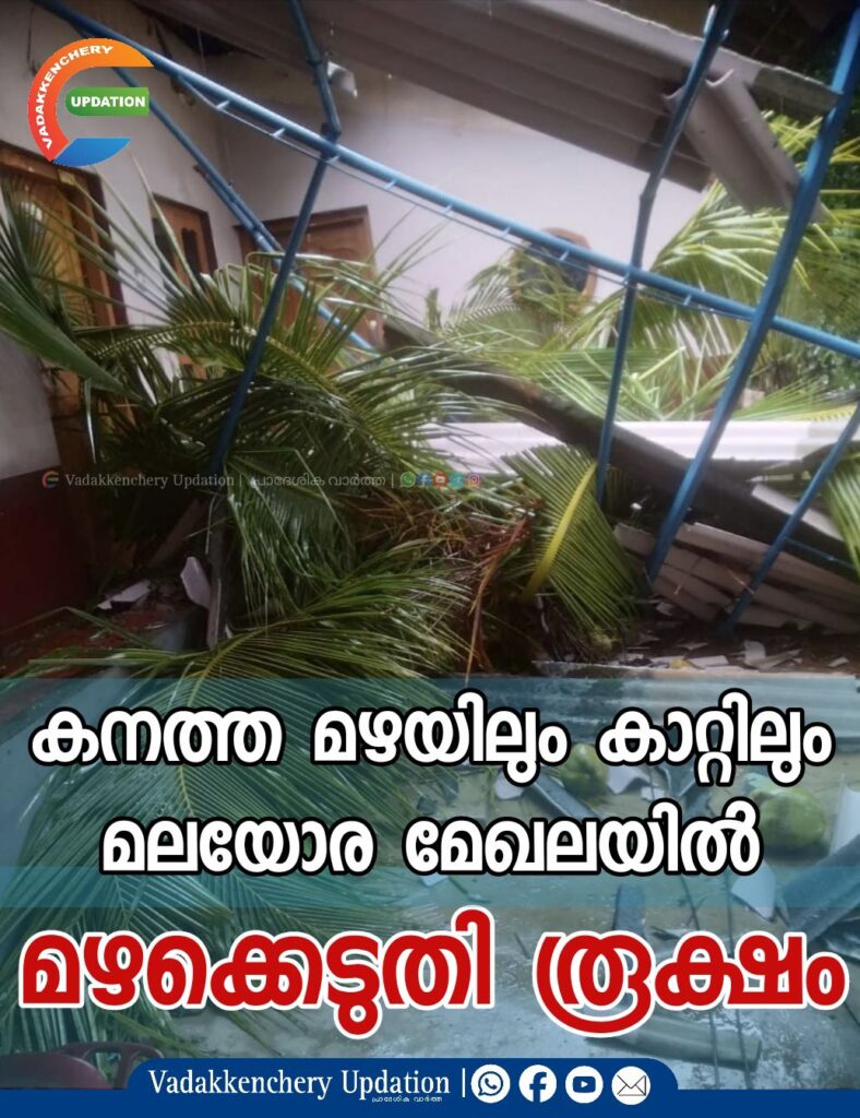 ചിറ്റിലഞ്ചേരിയിൽ കനത്ത കാറ്റിലും മഴയിലും മുടപ്പല്ലൂർ ഇലക്ട്രിക്കൽ സെക്ഷനു കീഴിൽ കനത്ത നാശം. നാല് ദിവസങ്ങളിലായി 15 എൽടി പോസ്റ്റുകളും രണ്ട് എച്ച്ടി പോസ്റ്റുകളുമാണ് മരങ്ങൾ വീണ് പൊട്ടിയത്. കൂടാതെ നൂറോളം ഭാഗങ്ങളിൽ മരം വീണ് വൈദ്യുത ലൈനുകളും തകർന്നിട്ടുണ്ട്. സെക്ഷനു കീഴിൽ മംഗലംഡാം മലയോര മേഖലയിലാണ് നാശം കൂടുതൽ. കീഴാല ഭാഗത്താണ് ഇന്നലെ എച്ച്ടി പോസ്റ്റുകൾ പൊട്ടിയത്. പോസ്റ്റുകൾ പൊട്ടിയത് പുനഃസ്ഥാപിക്കേണ്ടത് മൂലം മണിക്കൂറുകൾ പലയിടത്തും വൈദ്യുതി മുടങ്ങി.