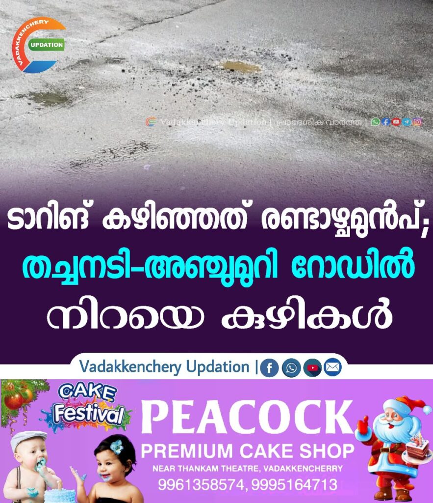 ടാറിങ് കഴിഞ്ഞ് രണ്ടാഴ്ച പിന്നിടുമ്പോഴേക്കും തച്ചനടി-അഞ്ചുമുറി റോഡിൽ കുഴികൾ വീണുതുടങ്ങി. കഴിഞ്ഞ ദിവസങ്ങളിൽ പെയ്ത കനത്ത മഴയിലാണ് റോഡിൽ കുഴികളായത്. ആളുകൾ ഏറ്റവും കൂടുതൽ ആശ്രയിക്കുന്ന റോഡാണിത്. നാലുവർഷത്തോളമായി തകർന്നുകിടന്നിരുന്ന റോഡിൽ യാത്രാദുരിതം രൂക്ഷമായിരുന്നു. ഏറെ പ്രതിഷേധങ്ങൾക്കൊടുവിൽ ബജറ്റിൽ ഒരു കോടി രൂപ വകയിരുത്തിയാണ് ടാറിങ് പൂർത്തിയാക്കിയത്. കുഴികൾ വീണതോടെ റോഡ് അതിവേഗം തകരുമെന്ന ആശങ്കയും ഉയർന്നിട്ടുണ്ട്.