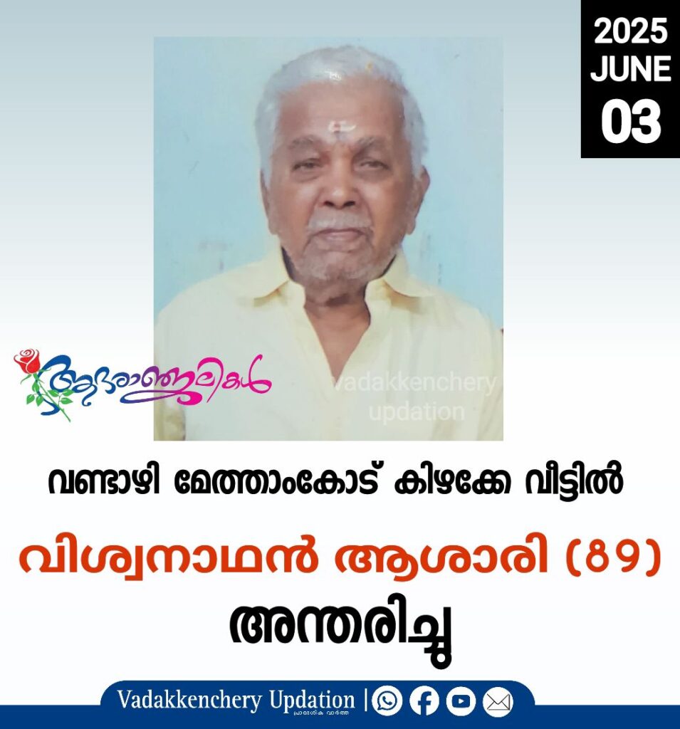 കിഴക്കേ വീട്ടിൽ വിശ്വനാഥൻ ആശാരി (89) അന്തരിച്ചു. സംസ്കാരം ഇന്ന് (03-06-2035) 5:00 ക്ക്. ഭാര്യ: രുഗ്മണി