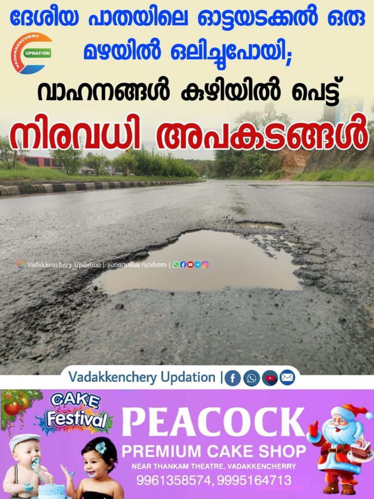 വടക്കഞ്ചേരി ദേശീയ പാതയിലെ ഓട്ടയടക്കൽ ഒരു മഴയിൽ ഒലിച്ചുപോയി. വടക്കഞ്ചേരി-മണ്ണുത്തി ആറുവരിപ്പാതയിൽ