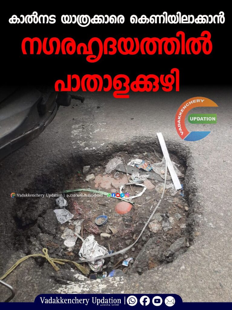 കാൽനട യാത്രക്കാരെ കെണിയിലാക്കാൻ വടക്കഞ്ചേരി നഗരഹൃദയത്തിൽ പാതാളക്കുഴി.