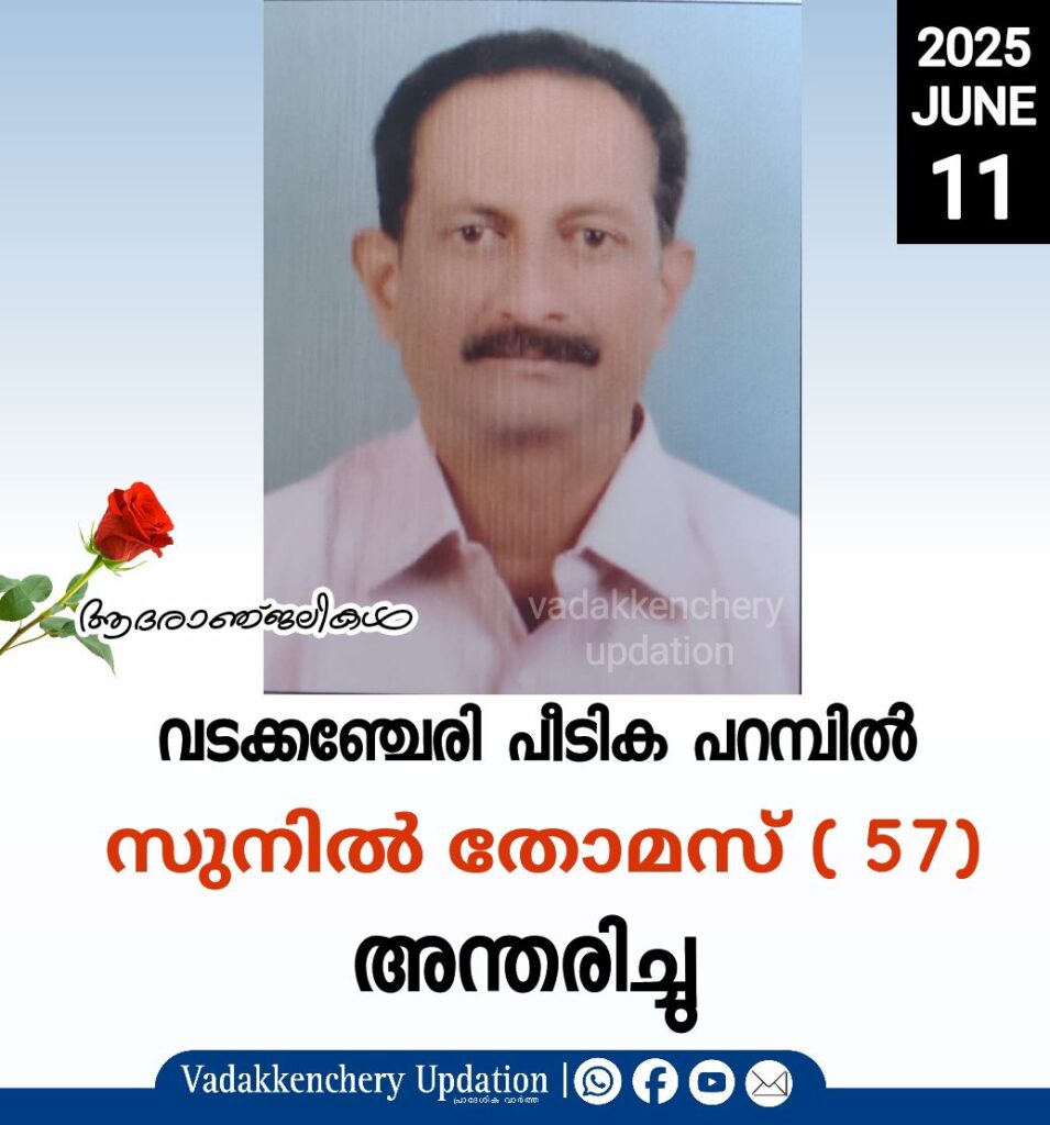 വടക്കഞ്ചേരി പീടിക പറമ്പിൽ പരേതനായ തോമസ് കുട്ടി മകൻ സുനിൽ തോമസ് ( 57) അന്തരിച്ചു. സംസ്ക്കാരം നാളെ (12-06-2025, വ്യാഴം) ഉച്ചക്ക് മൂന്ന് മണിക്ക് തേനിടുക്ക് സെൻ്റ് ജോർജ്ജ് യാക്കോബായ സുറിയാനി പള്ളിയിൽ. അമ്മ: ബേബി തോമസ്. ഭാര്യ: ഹണി . മകൻ ഡെൻസൺ. സഹോദരങ്ങൾ: ജോതി തോമസ്, അമ്പിളി ജോസ്.