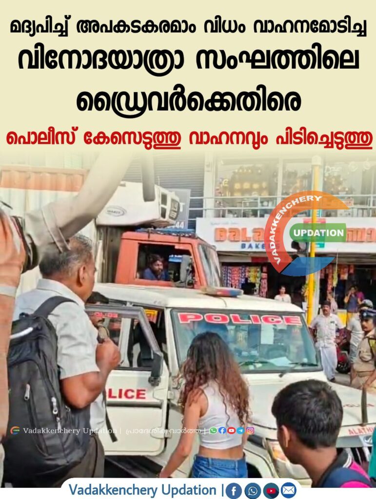 ആലത്തൂരിൽ മദ്യപിച്ച് അപകടകരമാം വിധം വാഹനമോടിച്ച വിനോദയാത്രാ സംഘത്തിലെ ഡ്രൈവർക്കെതിരെ ആലത്തൂർ പൊലീസ് കേസെടുത്തു. ആലുവ എടത്തല നോർത്ത് സ്വദേശി ആദിൽ ലിയാക്കത്ത് (28) നെതിരെയാണ് ആലത്തൂർ പൊലീസ് കേസെടുത്തത്. ആദിലും നാല് സുഹൃത്തുക്കളും ചേർന്ന് കൊടൈക്കനാലിൽ നിന്നും മടങ്ങി വരവേ വാളയാറിൽ വച്ച് വിദ്യാർത്ഥികളെ ഇടിക്കാൻ പോയതിനെ തുടർന്ന് പോലീസ്
