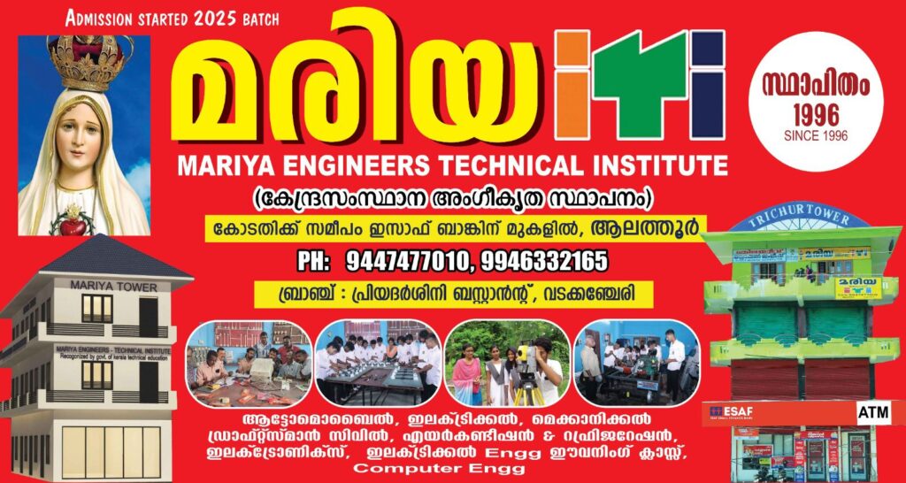 1 st Engneers Technical Institute (കേന്ദ്രസംസ്ഥാന അംഗീകൃത സ്ഥാപനം) പ്രിയദർശിനി ബസ്റ്റാന്റ് വടക്കഞ്ചേരി