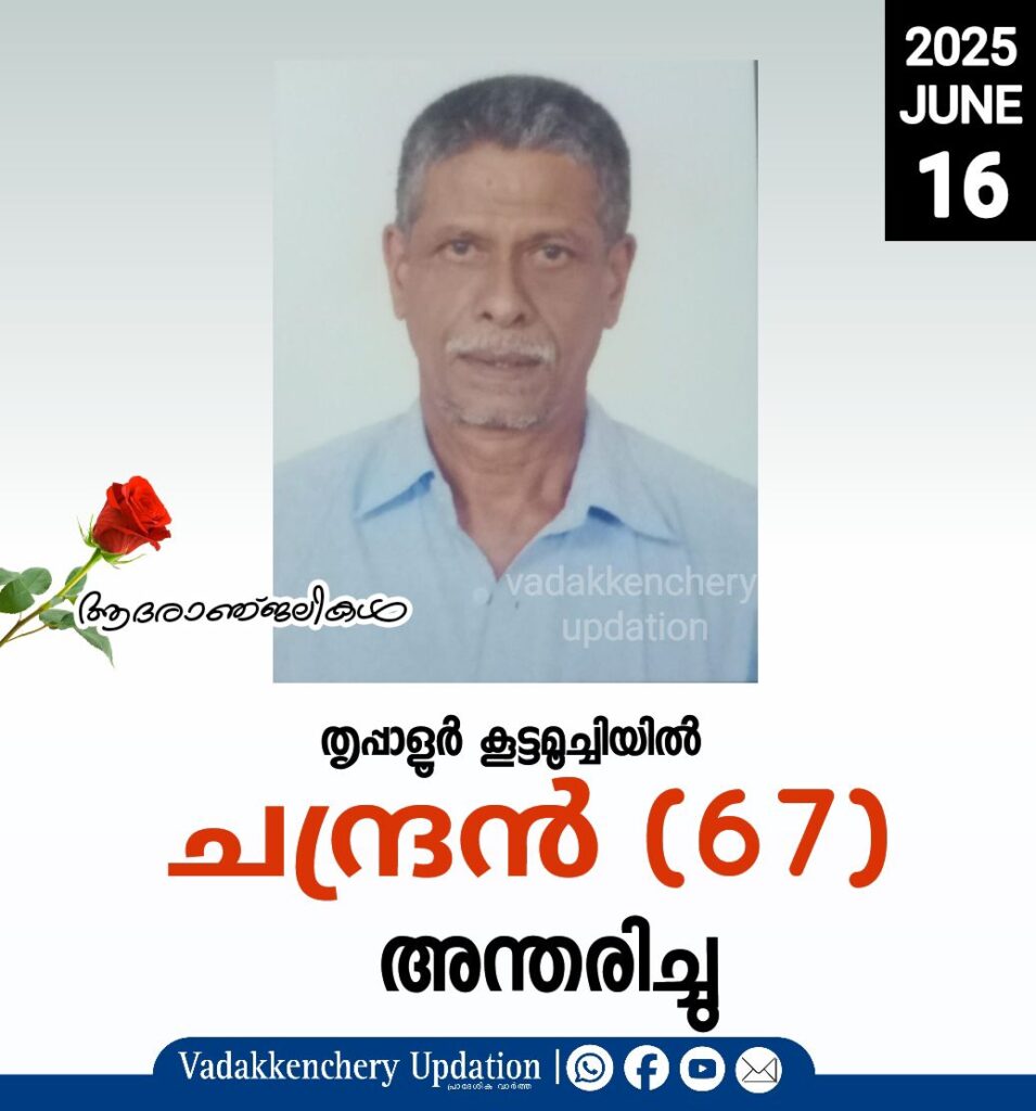 തൃപ്പാളൂർ കൂട്ടമൂച്ചിയിൽ ശങ്കരൻകുട്ടി മകൻ ചന്ദ്രൻ (67) അന്തരിച്ചു. സംസ്കാരം ഇന്ന് ഉച്ചയ്ക്ക് 1 മണിക്ക് കൂട്ടമൂചി പൊതുസ്മാശനത്തിൽ. ഭാര്യ: കോമളം. മക്കൾ: ധനേഷ്, ധനൂപ്. മരുമകൾ: ലക്ഷ്മി. സഹോദരങ്ങൾ: ശിവൻ,രവി,ലീല,ജാനകി,പ്രേമ,കോമളം, പാർവ്വതി,സൗതാമണി(ലേറ്റ്), വേശു