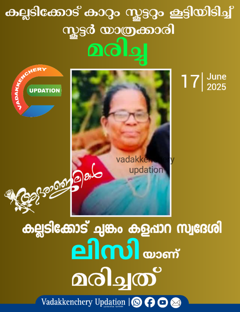 കല്ലടിക്കോട് ചുങ്കം കളപ്പാറ സ്വദേശി ലിസിയാണ് മരിച്ചത്. സ്കൂട്ടർ ഓടിച്ചിരുന്ന ടോണി തോമസിനും പരിക്കേറ്റിട്ടുണ്ട്. ലിസി സഞ്ചരിച്ചിരുന്ന സ്കൂട്ടർ ഒരു കാറിനെ മറികടക്കാൻ ശ്രമിക്കുന്നതിനിടെ പെട്ടെന്ന് നിലത്തുവീഴുകയായിരുന്നു. ഇതേ തുടർന്ന് ലിസി റോഡിലേക്ക് തെറിച്ചുവീണു. വീണതിന് പിന്നാലെ പിറകിൽ വരികയായിരുന്ന ഒരു പിക്കപ്പ് വാൻ ലിസിയുടെ ശരീരത്തിലൂടെ കയറിയിറങ്ങി. ഉടൻതന്നെ ആശുപത്രിയിൽ എത്തിച്ചുവെങ്കിലും ലിസിയുടെ ജീവൻ രക്ഷിക്കാൻ കഴിഞ്ഞില്ല. അപകടം കണ്ട കാർ നിയന്ത്രണം വിട്ട് ഒരു കുഴിയിലേക്ക് പതിക്കുന്നതിന്റെ സിസിടിവി ദൃശ്യങ്ങളും പുറത്തുവന്നിട്ടുണ്ട്. പരിക്കേറ്റ ടോണിയെയും മരിച്ച ലിസിയെയും ജില്ലാ ആശുപത്രിയിലേക്ക് മാറ്റിയിട്ടുണ്ട്. കാറുമായി കൂട്ടിയിടിച്ച് ആണോ ലിസിയുടെ സ്കൂട്ടർ മറിഞ്ഞത് നിയന്ത്രണം വിട്ടു മറിഞ്ഞതാണോ എന്ന കാര്യത്തിൽ വ്യക്തത വരാനുണ്ട്