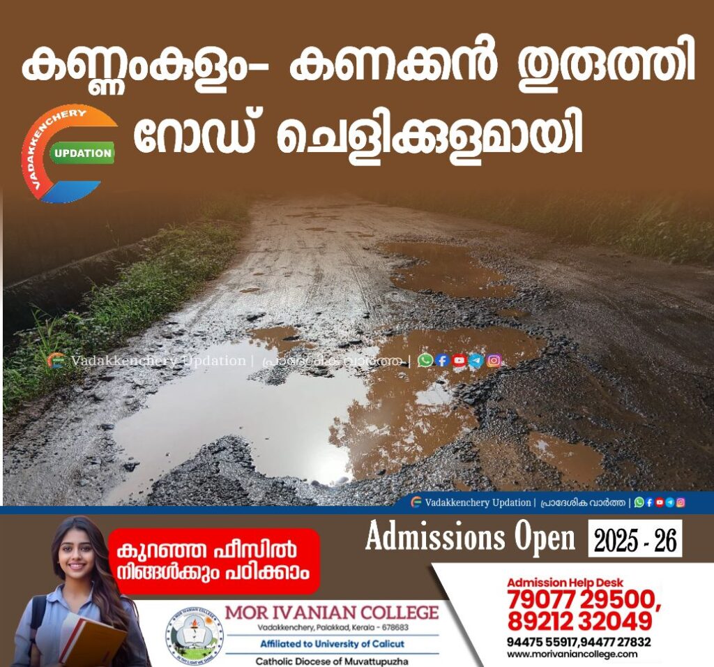 കിഴക്കഞ്ചേരി-വടക്കഞ്ചേരി പഞ്ചായത്തുകളെ ബന്ധിപ്പിക്കുന്ന കണ്ണംകുളം-കണക്കൻതുരുത്തി റോഡ് പൂർണമായും തകർന്നു. വൻ കുഴികൾ രൂപപ്പെട്ട് ചെളിക്കുളമായി കിടക്കുകയാണ് റോഡ്. പ്രധാനമന്ത്രി ഗ്രാമ സഡക് യോജനയിൽ പെടുത്തി നിർമിച്ച റോഡ് 5 വർഷം അറ്റകുറ്റ പണി നടത്തി പരിപാലിച്ചിരുന്നു. പിന്നീട് കിഴക്കഞ്ചേരി, വടക്കഞ്ചേരി പഞ്ചായത്തുകളും ജില്ലാ പഞ്ചായത്തും ഫണ്ട് മുടക്കി പുതിയ റോഡ് നിർമിച്ചു. എന്നാൽ നിർമാണം പൂർത്തിയാക്കി അധികം വൈകാതെ റോഡിന്റെ തകർച്ചയും ആരംഭിച്ചു.