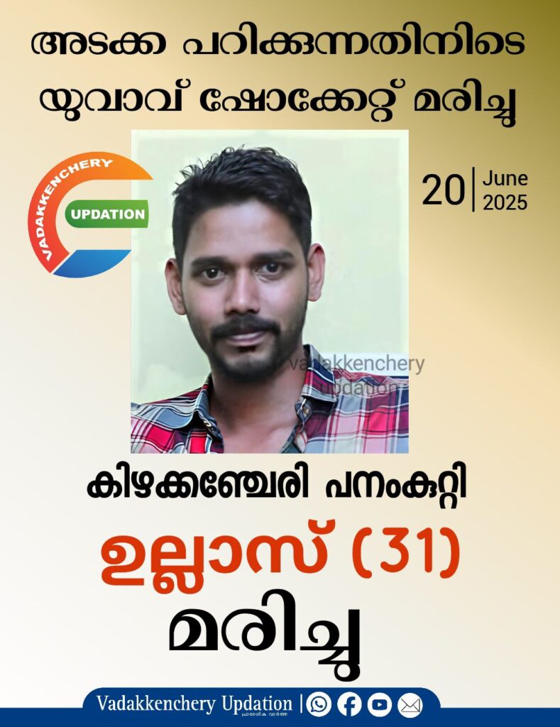 കിഴക്കഞ്ചേരി പനംകുറ്റി സ്വദേശി ഉല്ലാസ് (31)ആണ് മരിച്ചത്. ഇന്ന് വൈകിട്ട് 4.30 ഓടുകൂടിയാണ് സംഭവം. സുഹൃത്തിന്റെ വീട്ടിൽ ഇലക്ട്രീഷ്യൻ ജോലികൾക്ക് ശേഷം പറമ്പിലെ അടയ്ക്ക പറിക്കുന്നതിനിടെ കവുകിൽ ചാരി വെച്ച ഇരുമ്പ് കോണി തെന്നുകയും ഉല്ലാസിന്റെ കയ്യിലുള്ള ഇരുമ്പ് തോട്ടി സമീപത്തെ ഇലക്ട്രിക് ലൈനിൽ തട്ടിയതാണ് ഷോക്കേൽക്കാൻ കാരണം.