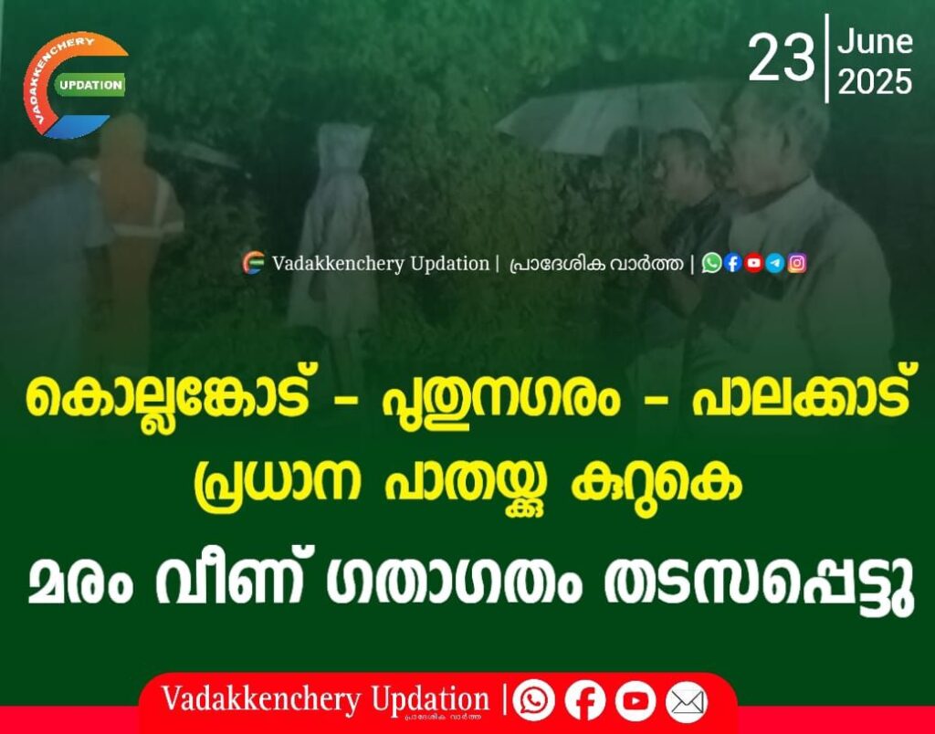 വടവന്നൂർ കള്ളുഷാപ്പ് മുക്കിലെ വാകമരമാണു റോഡിലേക്കു വീണത്. ഇന്നലെ വൈകിട്ട് ഏഴരയോടെയാണു സംഭവം. മരം വീഴുന്ന സമയത്ത് റോഡിന്റെ ഇരുവശത്തും വാഹനങ്ങൾ ഉണ്ടായിരുന്നു. കൊല്ലങ്കോട് നിന്നു അഗ്നിരക്ഷാ സേനാംഗങ്ങൾ എത്തി മരം മുറിച്ചു മാറ്റിയതിനു ശേഷം രാത്രി വൈകി ഗതാഗതം പുനഃസ്ഥാപിച്ചു.