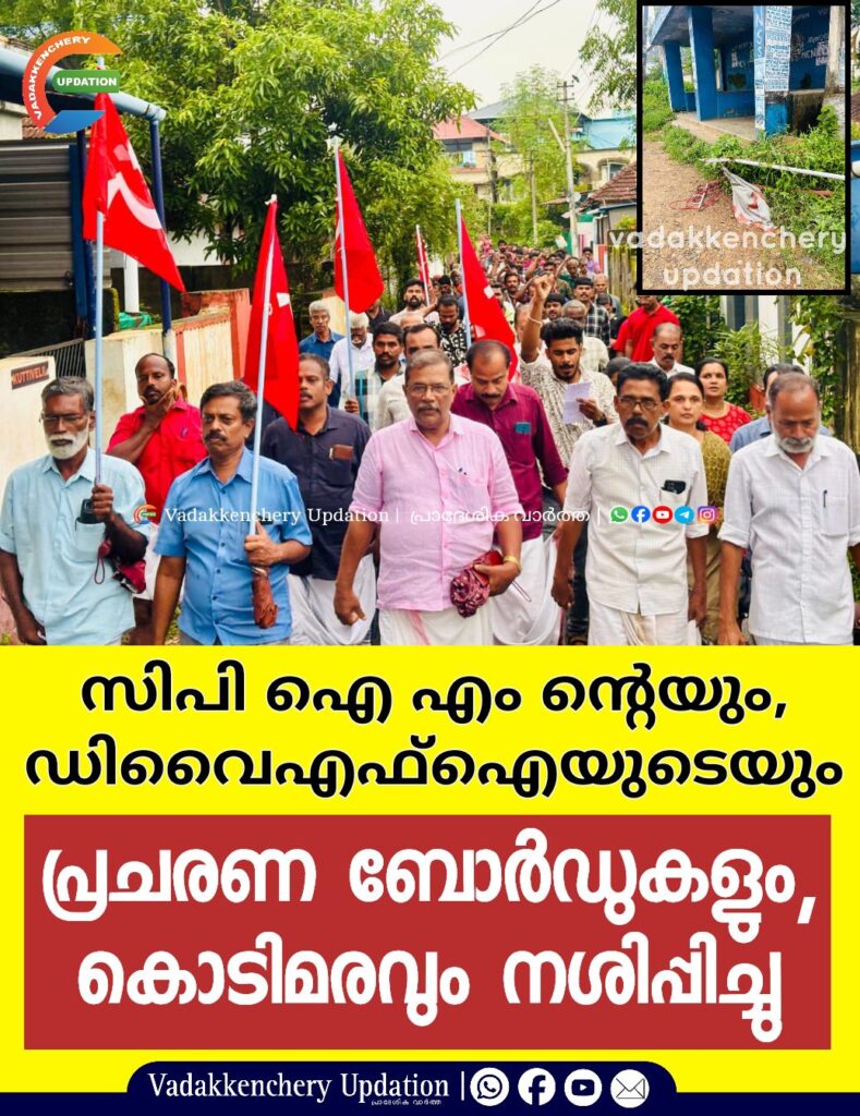 സിപി ഐ എം ൻ്റെയും, ഡിവൈഎഫ് ഐയുടെയും പ്രചരണ ബോർഡുകളും, കൊടിമരവും നശിപ്പിച്ചു.വടക്കഞ്ചേരി പാളയത്ത് സ്ഥാപിച്ച കൊടിമരങ്ങളാണ് നശിപ്പിച്ചത്.ഇരുമ്പിൻ്റെ കൊടിമരങ്ങളും, സംസ്ഥാന സർക്കാരിൻ്റെ നാലാം വാർഷികത്തിൻ്റെ ഭാഗമായി സ്ഥാപിച്ച ബോർഡുകളും നശിപ്പിച്ചിട്ടുണ്ട്.ശനിയാഴ്ച രാത്രിയാണ് സംഭവം. സംഭവത്തിൽ അന്വേഷണം ആവശ്യപ്പെട്ട് സി പി ഐ എം വടക്കഞ്ചേരി ലോക്കൽ സെക്രട്ടറി കെ പ്രഭാകരൻ പൊലീസിൽ പരാതി നല്കി. സംഭവത്തിൽ പ്രതിഷേധിച്ച് പ്രകടനം നടത്തി.സി പി ഐ എം ഏരിയ സെക്രട്ടറി ടി കണ്ണൻ ഉദ്ഘാടനം ചെയ്തു. രമ ജയൻ അധ്യക്ഷയായി.സി തമ്പു,കെ പ്രഭാകരൻ, ആൻ്റണി എന്നിവർ സംസാരിച്ചു.