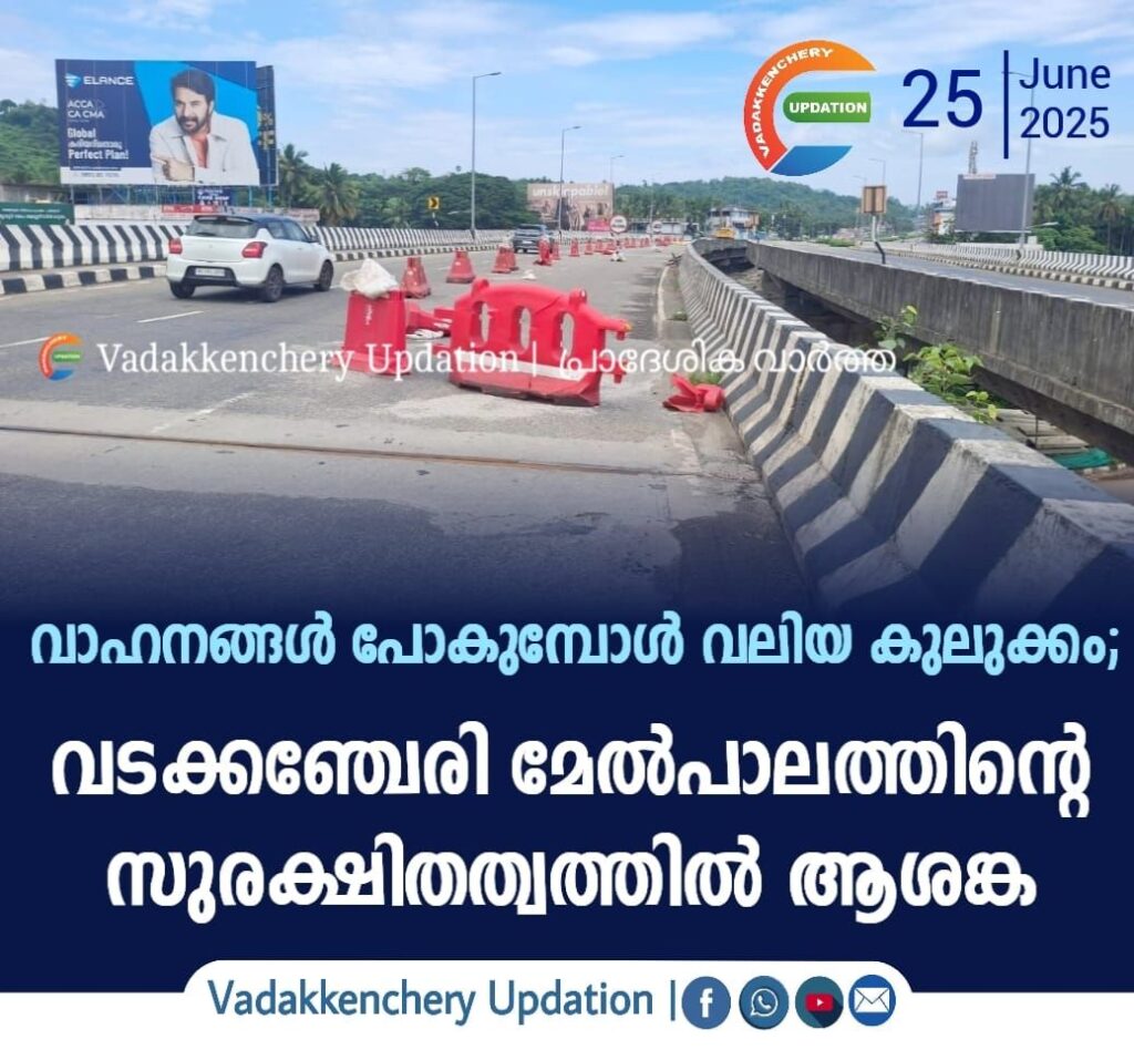 മണ്ണുത്തി – വടക്കഞ്ചേരി ആറുവരിപ്പാതയിലെ വടക്കഞ്ചേരി മേൽപാലത്തിന്റെ സുരക്ഷിതത്വത്തിൽ ആശങ്ക. പാലത്തിന്റെ തൃശൂർ ദിശയിലേക്കുള്ള ഭാഗം രണ്ടു ജോയിന്റുകൾ കുത്തിപ്പൊളിച്ചു പണികൾ നടത്തി.വാഹനങ്ങൾ പോകുമ്പോൾ വലിയ ശബ്ദവും കുലുക്കവും അനുഭവപ്പെട്ടതോടെയാണു രണ്ടു ജോയിന്റുകൾ ചേരുന്ന ഭാഗത്തെ ടാറിങ് കുത്തിപ്പൊളിച്ചു പുതിയ കമ്പികൾ പാകി ബലപ്പെടുത്താൻ ശ്രമം നടക്കുന്നത്. പൊളിക്കുന്ന ഭാഗത്തെ ഗതാഗതം നിരോധിച്ചാണു നിർമാണം. മേൽപാലത്തിന്റെ പല ഭാഗത്തും ടാറിങ് ഇടിഞ്ഞു താഴുന്നതു സ്ഥിരമായി.