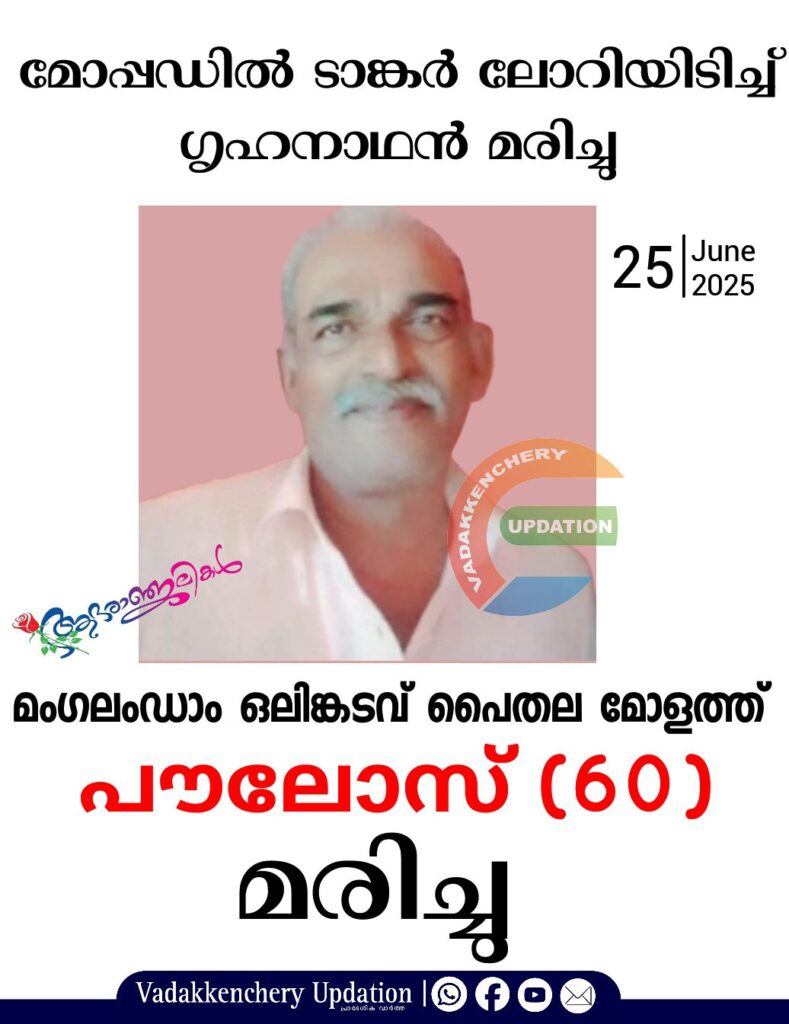 മംഗലംഡാം ഒലിങ്കടവ് പൈതല മോളത്ത് വീട്ടിൽ പൗലോസ് (60) ആണ് മരിച്ചത്. ഇന്ന് (25-06-2025, ബുധൻ) പകൽ 11 മണിയോടെ ആണ് സംഭവം.
