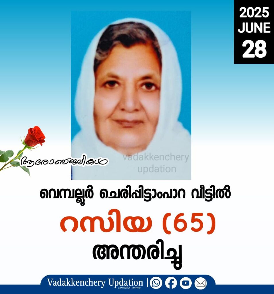വെമ്പല്ലൂർ ചെരിപ്പിട്ടാംപാറ വീട്ടിൽ റസിയ (65) അന്തരിച്ചു. സംസ്കാരം ഇന്ന് (28-06-2025) ഒമ്പത് മണിക്ക് (AM) അരീക്കോട് ജുമാ മസ്ജിദിൽ.