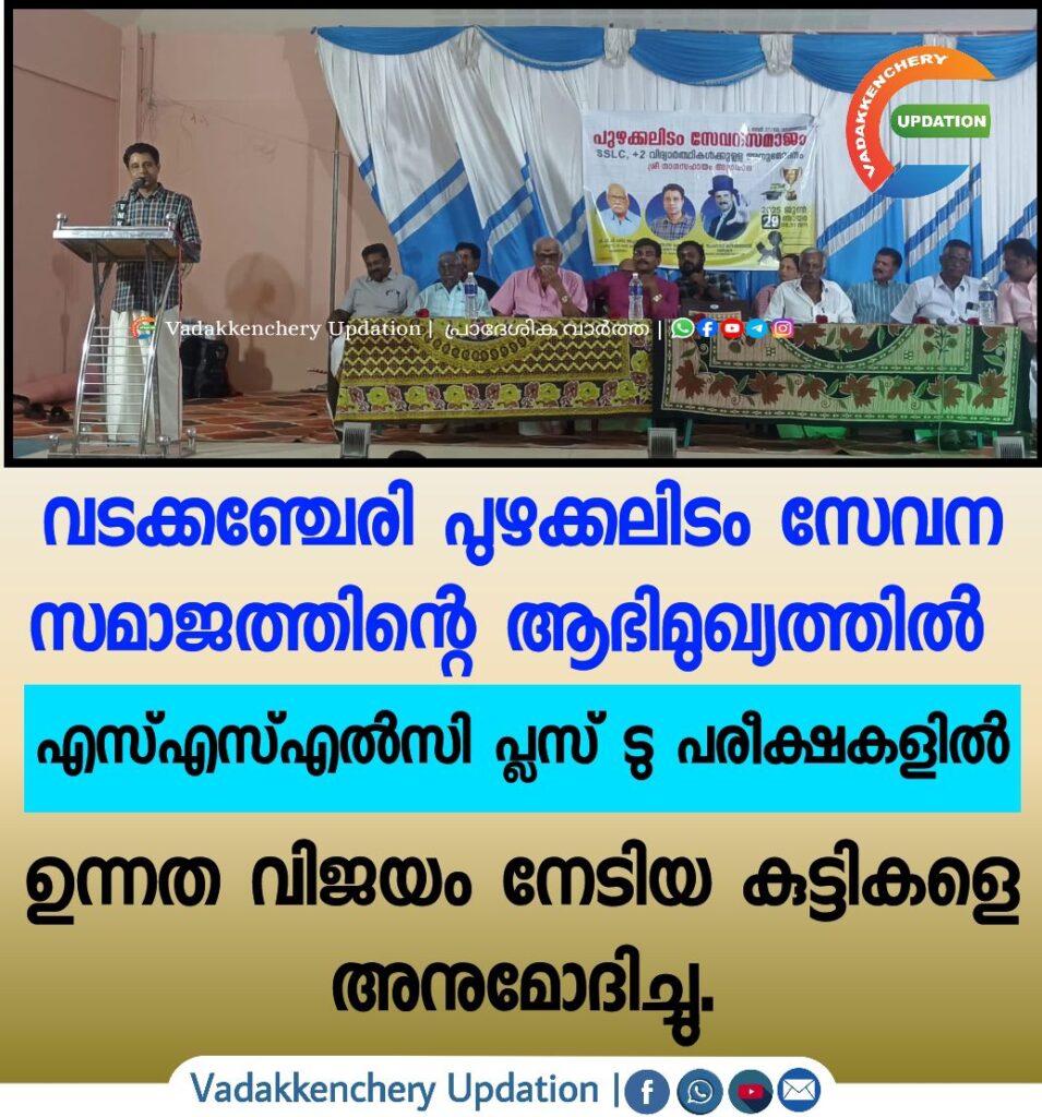 വടക്കഞ്ചേരി പുഴക്കലിടം സേവന സമാജത്തിന്റെ ആഭിമുഖ്യത്തിൽ 2024 -25 വർഷത്തെ എസ്എസ്എൽസി പ്ലസ് ടു പരീക്ഷകളിൽ ഉന്നത വിജയം നേടിയ കുട്ടികളെ അനുമോദിച്ചു. കുടുംബാംഗമായ കെ. പി ജയശ്രിയുടെ പ്രാർത്ഥനയോടുകൂടി ചടങ്ങിന് തുടക്കം കുറിച്ചു. ചടങ്ങിന് പുഴക്കലിടം സേവനസമാജം പ്രസിഡൻ്റ് വി പി പങ്കുഅച്ചൻ അധ്യക്ഷത വഹിച്ചു. ഉദ്ഘാടനവും സമ്മാനദാനവും സി .എ ഹയർ സെക്കൻഡറി സ്കൂൾ അധ്യാപകൻ കെ .എം രൺധീർ നിർവഹിച്ചു. പുഴക്കലിടം സേവന സമാജം സെക്രട്ടറി പി കെ ജയകുമാർ മാസ്റ്റർ യോഗത്തിന് സ്വാഗതം പറഞ്ഞു. വാർഡ് മെമ്പർ സി മുത്തു , കെ.പി കേലുകുട്ടി മേനോൻ, കെ പി സേതുമാധവൻ [രക്ഷാധികാരികൾ ,സേവന സമാജം] പി.കെ ജയകുമാർ , പി.കെ നന്ദകുമാർ [ വൈസ് പ്രസിഡൻ്റുമാർ , സേവന സമാജം ] സമാജം എക്സിക്യൂട്ടീവ് അംഗങ്ങളായ കെ .പി ഗോവിന്ദൻ, വി. പി ഉണ്ണികൃഷ്ണൻ, പി.കെ സൂര്യനാരായണൻ, പി. റ്റി അഞ്ജന ടീച്ചർ, പി കെ നാരായണൻകുട്ടി എന്നിവർ ആശംസകൾ രേഖപ്പെടുത്തി. പ്രശസ്ത മജീഷ്യൻ ശ്രീ പ്രേംദാസിന്റെ മാജിക് ഷോ ചടങ്ങിൻ്റെ മാറ്റുകൂട്ടി. പുഴക്കലിടം സേവന സമാജം ജോ: സെക്രട്ടറി പി.റ്റി ഗോപിനാഥൻ വേദിയിൽ നന്ദി പ്രകാശിപ്പിച്ചു.