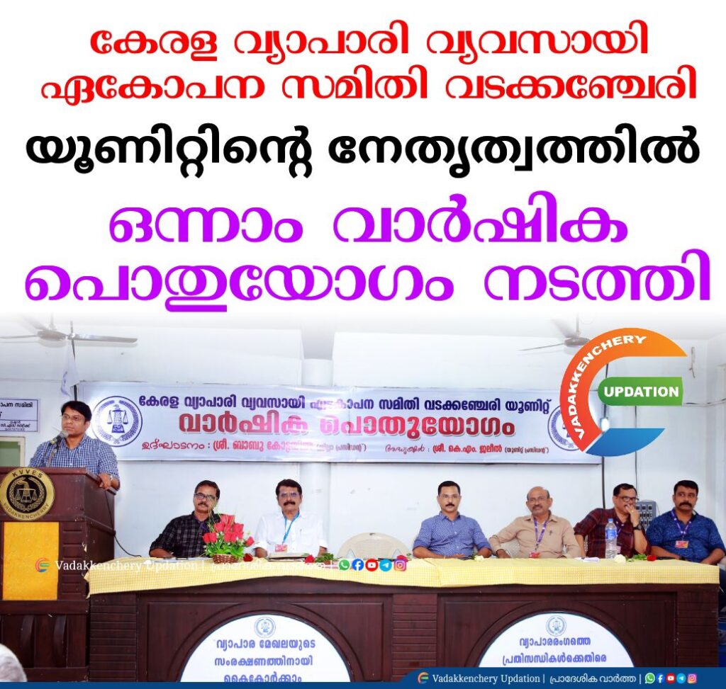 കേരള വ്യാപാരി വ്യവസായി ഏകോപന സമിതി വടക്കഞ്ചേരി യൂണിറ്റിൻ്റെ ഒന്നാം വാർഷിക പൊതുയോഗം ജില്ലാ പ്രസിഡണ്ട് ബാബു കോട്ടയിൽ ഉദ്ഘാടനം ചെയ്തു. യൂണിറ്റ് പ്രസിഡണ്ട് കെ.എം.ജലീൽ അദ്ധ്യക്ഷത വഹിച്ച യോഗത്തിന് ജന.സെക്രട്ടറി സിജു എം.ഡി.സ്വാഗതം പറഞ്ഞു. വ്യാപാരികളെ തകർക്കുന്ന വിദ്യാഭ്യാസ സ്ഥാപനങ്ങളിലെ അനധികൃത വ്യാപാരത്തിനെതിരെ യോഗം പ്രമേയം പാസാക്കി. യൂണിറ്റ് വനിതാ വിംഗ് പ്രസിഡണ്ടായി , രാധ, ജന.സെക്രട്ടറി എ.ശ്രുതി, ട്രഷറർ ഗീതു പി.ശിവൻ എന്നിവരെ യോഗം തിരഞ്ഞെടുത്തു. കെ. അനിൽ പ്രകാശ് സി.പി.മോഹനൻ, സി.എസ്.സിദ്ദിക്ക് ഫെബിൻ മുഹമ്മദലി , ബിൻസി സെബാസ്റ്റ്യൻ, വി.രവി, വി.എസ്.ഷംസുദ്ദീൻ, ഷെരീഫ് എന്നിവർ യോഗത്തിൽ സംസാരിച്ചു.