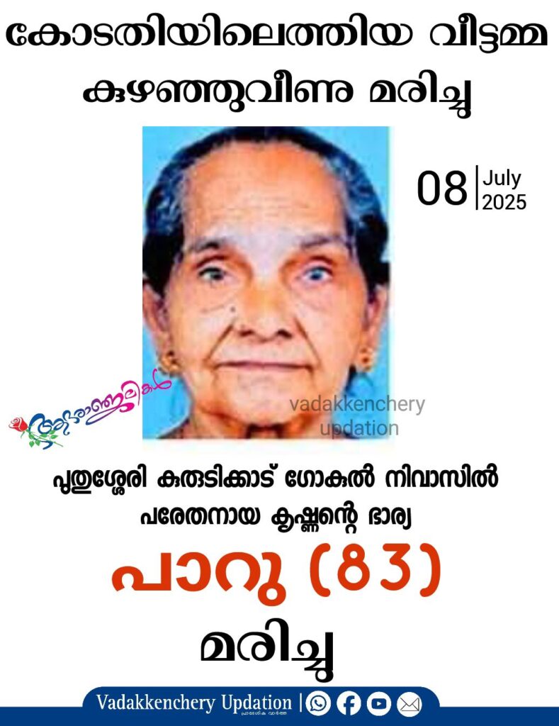 കോടതിയിലെത്തിയ വീട്ടമ്മ കുഴഞ്ഞുവീണു മരിച്ചു. പുതുശ്ശേരി കുരുടിക്കാട് ഗോകുൽ നിവാസിൽ പരേതനായ കൃഷ്ണന്റെ ഭാര്യ പാറു (83) ആണു മരിച്ചത്. ഇന്നലെ രാവിലെ ഒൻപതരയോടെയാണു സംഭവം.സിവിൽ സ്റ്റേഷനകത്തുള്ള കോടതിവരാന്തയിൽ നിൽക്കുന്നതിനിടെ പാറു കുഴഞ്ഞുവീഴുകയായിരുന്നെന്നു കൂടെയുണ്ടായിരുന്നവർ പറഞ്ഞു. സിവിൽ സ്റ്റേഷനിലുണ്ടായിരുന്ന സുരക്ഷാ ഉദ്യോഗസ്ഥർ ഉടൻതന്നെ 108 ആംബുലൻസ് എത്തിച്ച് ഇവരെ ജില്ലാ ആശുപത്രിയിൽ എത്തിച്ചെങ്കിലും രക്ഷിക്കാനായില്ല. പോസ്റ്റ്മോർട്ടത്തിനു ശേഷം സംസ്കാരം നടത്തി. വസ്തുതർക്കവുമായി ബന്ധപ്പെട്ട കേസിന്റെ ഭാഗമായാണ് ഇവർ ഒറ്റയ്ക്കു കോടതിയിലെത്തിയതെന്നാണു ബന്ധുക്കൾ പറയുന്നത്. മക്കൾ: വസന്ത, ഷൈല, വിജി, ഗിരിജ, ശ്രീജ.