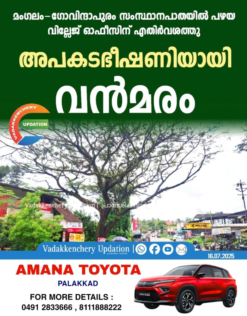 മംഗലം – ഗോവിന്ദാപുരം സംസ്ഥാനപാതയിൽ പഴയ വില്ലേജ് ഓഫീസിന് എതിർവശത്തു അപകടഭീഷണിയായി വൻമരം ദ്രവിച്ചു വീഴാറായി നിൽക്കുന്നു.