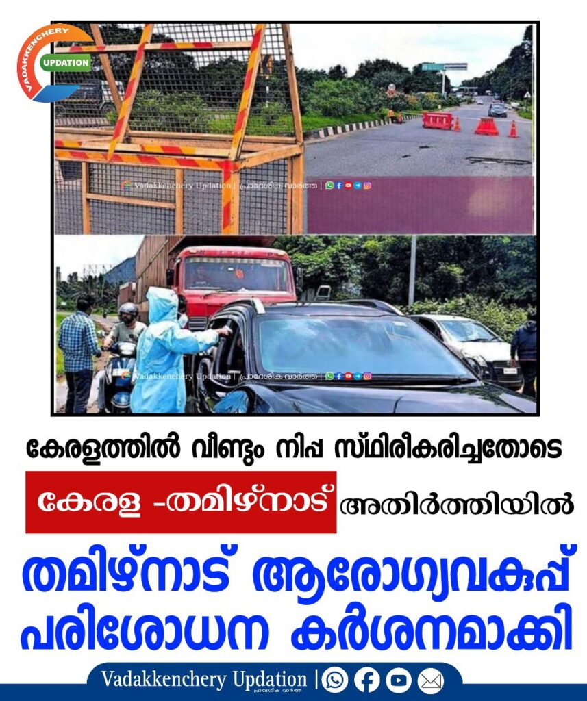 കേരളത്തിൽ വീണ്ടും നിപ്പ സ്ഥിരീകരിച്ചതോടെ കേരള – തമിഴ്നാട് അതിർത്തിയിൽ തമിഴ്നാട് ആരോഗ്യവകുപ്പ് പരിശോധന കർശനമാക്കി. ദേശീയപാത ഭാഗികമായി അടച്ചിട്ട് കേരളത്തിൽ നിന്നെത്തുന്ന മുഴുവൻ വാഹന യാത്രക്കാരെയും പരിശോധിച്ചാണ് കടത്തിവിടുന്നത്. കോയമ്പത്തൂർ ജില്ലാ കലക്ടർ പവൻകുമാർ ജി.ഗിരിയപ്പനവറുടെ നിർദേശപ്രകാരമാണു ചാവടി ഉൾപ്പെടെയുള്ള അതിർത്തികളിൽ 24 മണിക്കൂറും പരിശോധന ആരംഭിച്ചത്.