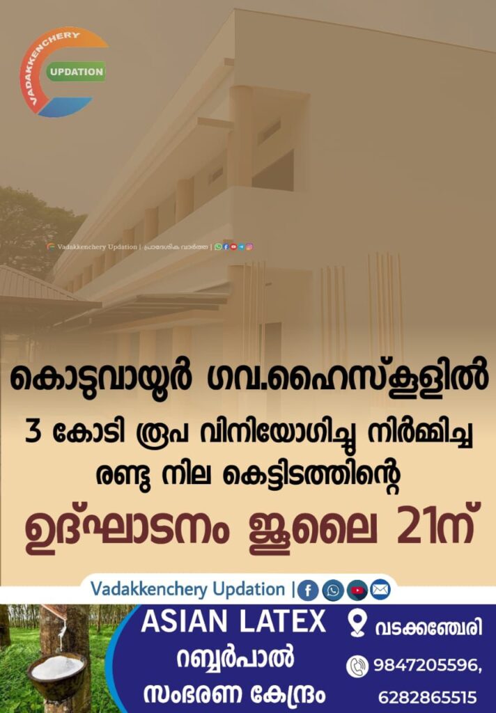കൊടുവായൂർ ഗവ.ഹൈസ്കൂളിൽ 3 കോടി രൂപ വിനിയോഗിച്ചു നിർമിച്ച രണ്ടു നില കെട്ടിടത്തിന്റെ നിർമാണം പൂർത്തിയായി. മന്ത്രി വി.ശിവൻകുട്ടി 21നു രാവിലെ 10ന് ഉദ്ഘാടനം ചെയ്യും. പൊതുവിദ്യാഭ്യാസ സംരക്ഷണ യജ്ഞത്തിന്റെ ഭാഗമായി ഭൗതിക സാഹചര്യവും പഠന നിലവാരവും രാജ്യാന്തര നിലവാരത്തിലേക്ക് ഉയർത്തുന്നതിന്റെ ഭാഗമായി പ്ലാൻ ഫണ്ടിൽ നിന്നു 3 കോടി രൂപ വിനിയോഗിച്ചാണു കൊടുവായൂർ ഗവ. ഹൈസ്കൂളിൽ രണ്ടു നില കെട്ടിടം നിർമിച്ചി രിക്കുന്നത്. രണ്ടു നിലകളിലായി 6 ക്ലാസ് മുറികളും അധ്യാപകർക്കുള്ള ഒരു മുറിയും ആണു പുതിയ കെട്ടിടത്തിലുള്ളത്.