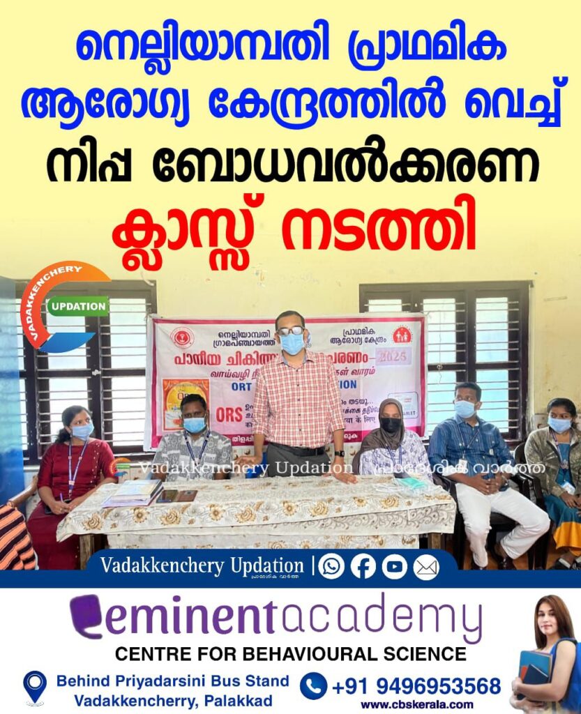 സംസ്ഥാന ആരോഗ്യ വകുപ്പിന്റെയും പാലക്കാട് ജില്ലാ മെഡിക്കൽ ഓഫീസിന്റെയും പ്രത്യേക നിർദ്ദേശ പ്രകാരം നെല്ലിയാമ്പതി ഗ്രാമ പഞ്ചായത്ത് പ്രഥമിക ആരോഗ്യ കേന്ദ്രം എന്നിവയുടെ ആഭിമുഖ്യത്തിൽ ഇന്നലെ നെല്ലിയാമ്പതി പ്രാഥമിക ആരോഗ്യ കേന്ദ്രത്തിൽ വെച്ച് നിപ്പാ ബോധവൽക്കരണ ക്ലാസ്സ് നടത്തി. മെഡിക്കൽ ഓഫീസർ ഡോ മനു തോമസ് ബോധവൽക്കരണ ക്ലാസ്സ് ഉൽഘടനം ചെയ്തു നിപ്പാ രോഗത്തെ കുറിച്ച് സംസാരിച്ചു. തുടർന്ന് ഹെൽത്ത് ഇൻസ്പെക്ടർ ജെ ആരോഗ്യം ജോയ്സൺ നിപ്പാ പ്രതിരോധ പ്രവർത്തനങ്ങളെ കുറിച്ചും, ജൂനിയർ ഹെൽത്ത് ഇൻസ്പെക്ടർ ബി അഫ്സൽ ഡെങ്കിപനിയും കൊതുക് നശികരണ പ്രവർത്തനങ്ങളെ കുറിച്ചും ബോധവൽക്കരണ ക്ലാസ്സ് നൽകി.
