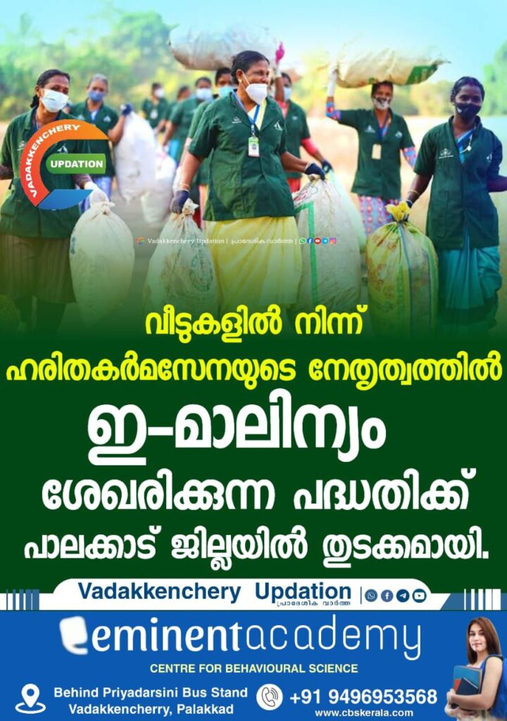 വീടുകളിൽ നിന്ന് ഹരിതകർമസേനയുടെ നേതൃത്വത്തിൽ ഇ-മാലിന്യം ശേഖരിക്കുന്ന പദ്ധതിക്ക് ജില്ലയിൽ തുടക്കമായി. ഇക്കഴിഞ്ഞ 15 മുതലാണ് ഹരിതകർമസേനാംഗ ങ്ങൾ വീടുകളിൽ നിന്ന് ഒഴിവാക്കിയ ട്യൂബ് ലൈറ്റ്, മോട്ടർ, മിക്സി, ടിവി തുടങ്ങിയ ഇലക്ട്രോണിക് മാലിന്യം ശേഖരിക്കാൻ തുടങ്ങിയത്. അങ്ങോട്ടു പണം നൽകിയാണ് ഹരിതകർമസേന ഇതു ശേഖരിക്കുന്നത്.