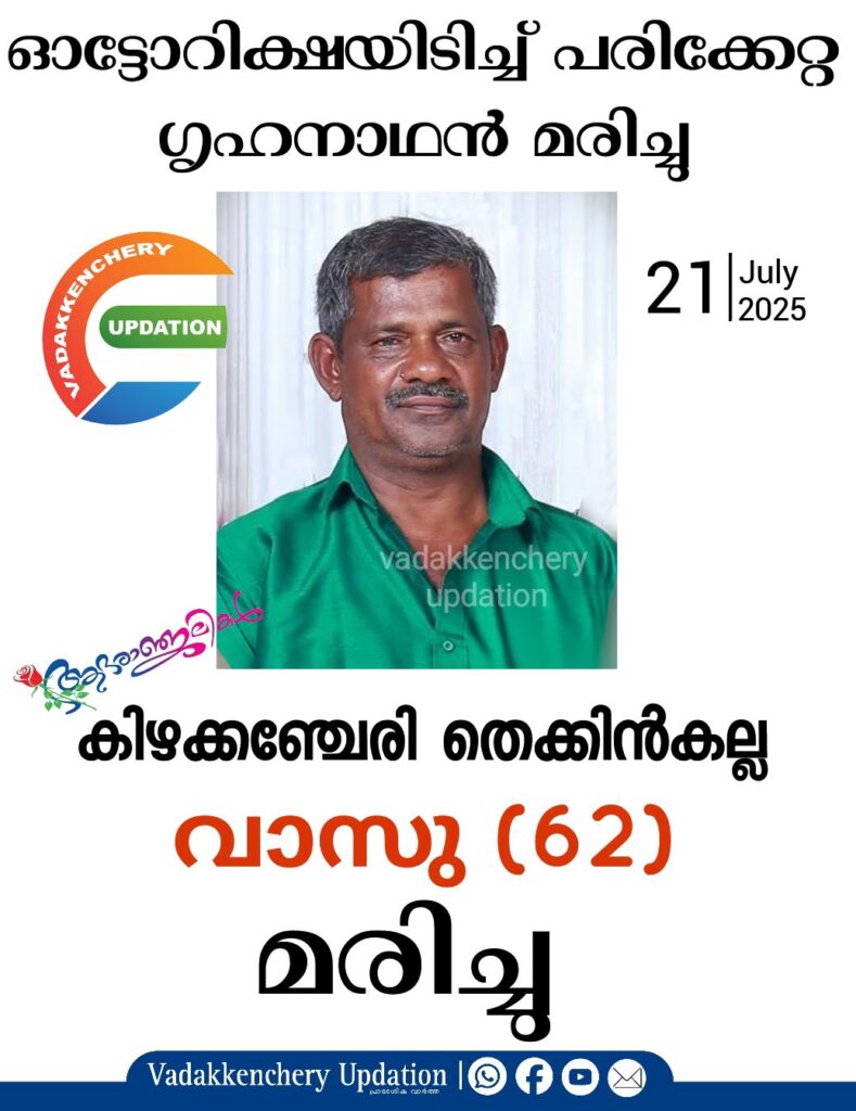 ഓട്ടോറിക്ഷയിടിച്ച് പരിക്കേറ്റ ഗൃഹനാഥൻ മരിച്ചു.കിഴക്കഞ്ചേരി തെക്കിൻകല്ല വാസു ( 62 ) ആണ് മരിച്ചത് ഞായറാഴ്ച രാത്രി 12 മണിയോടുകൂടി ഒലവക്കോട് വച്ചാണ് അപകടം സംഭവിച്ചത്. ലോറി ഡ്രൈവറായ വാസു ഒലവക്കോട് ജംഗ്ഷനിൽ ലോറി നിർത്തി ഭക്ഷണം കഴിക്കാൻ ഇറങ്ങിയപ്പോൾ ഓട്ടോറിക്ഷ ഇടിക്കുകയായിരുന്നു. ഉടൻ തന്നെ പാലക്കാട് ജില്ലാ ആശുപത്രിയിലും, പിന്നീട് തൃശൂരിലെ സ്വകാര്യ ആശുപത്രിയിലും പ്രവേശിപ്പിച്ചെങ്കിലും തിങ്കളാഴ്ച പകൽ 12 മണിയോടുകൂടി മരിച്ചു.