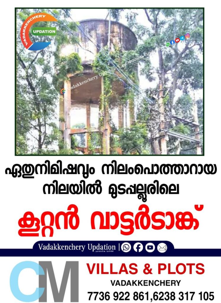 മുടപ്പല്ലൂർ ടൗണില് മംഗലംഡാം റോഡില് പെട്രോള് പമ്പിനും വീടുകള്ക്കും സമീപം ഏതുനിമിഷവും തകർന്നുവീഴാമെന്ന നിലയില് കൂറ്റൻ വാട്ടർടാങ്ക്. മുപ്പതടിയോളം ഉയരമുള്ള ടാങ്കിന്റെ ഒരുഭാഗത്തെ രണ്ടു പില്ലറുകളുടെയും കമ്പികള് തുരുമ്പിച്ച് ദ്രവിച്ച് തകർന്ന നിലയിലാണ്. മറ്റൊരു പില്ലറില് വലിയ വിള്ളലുകളുമുണ്ട്.