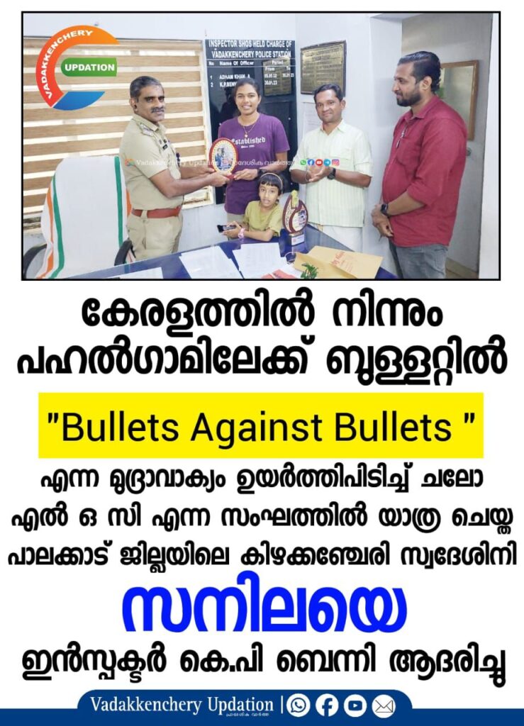 കേരളത്തിൽ നിന്നും പഹൽഗാമിലേക്ക് ബുള്ളറ്റിൽ “Bullets Against Bullets “എന്ന മുദ്രാവാക്യം ഉയർത്തിപിടിച്ച് ചലോ LOC എന്ന സംഘത്തിൽ യാത്ര ചെയ്ത പാലക്കാട് ജില്ലയിലെ കിഴക്കഞ്ചേരി സ്വദേശിനി സനിലയെ ഇൻസ്പക്ടർ കെ.പി ബെന്നി ആദരിച്ചു.