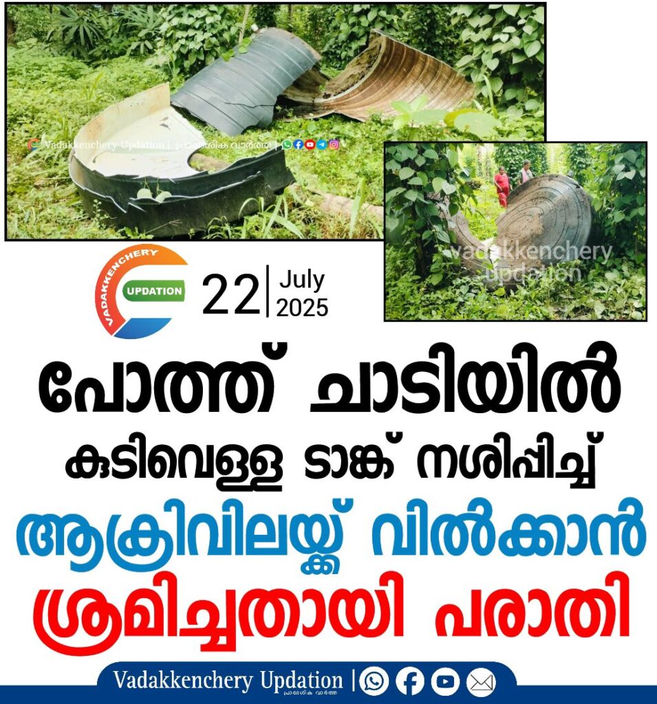 കണ്ണമ്പ്ര പഞ്ചായത്തിലെ പോത്തു ചാടി എന്ന പ്രദേശത്ത് കുടിവെള്ള ടാങ്ക് ഫോറസ്റ്റ് ഗാർഡ് നശിപ്പിച്ച് ആക്രിവിലയ്ക്ക് വിൽക്കാൻ ശ്രമിച്ചതായി നാട്ടിക്കാരുടെ പരാതി. സ്വകാര്യ വ്യക്തിയുടെ പറമ്പിൽ ഇരുന്ന പഞ്ചായത്തിന്റെ റക്കാണ്ടി പോത്തിയാടി കുടിവെള്ള പദ്ധതിയുടെ ടാങ്ക് അനുവാദം ഇല്ലാതെ ആക്രിക്കാർക്ക് ഫോറസ്റ്റ് ഗാർഡ് കൊടുത്തു എന്നാണ് പരാതി പറയുന്നത്. ഫോറസ്റ്റ് ഗാർഡിനെതിരെ ഫോറസ്റ്റ് ഓഫിസിൽ നാട്ടുകാർ പരാതി പെട്ടു.