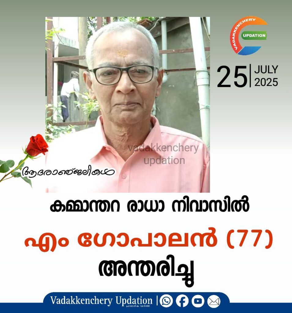പുഴക്കലിടം ശ്രീദേവി ഹനുമാൻ ക്ഷേത്രത്തിനടുത്തു ഇപ്പോൾ താമസം കമ്മാന്തറ രാധാ നിവാസിൽ എം ഗോപാലൻ (77) അന്തരിച്ചു.MTUPS കമ്മാന്തറ സ്കൂൾ മുൻ ജീവനക്കാരനാണ്.