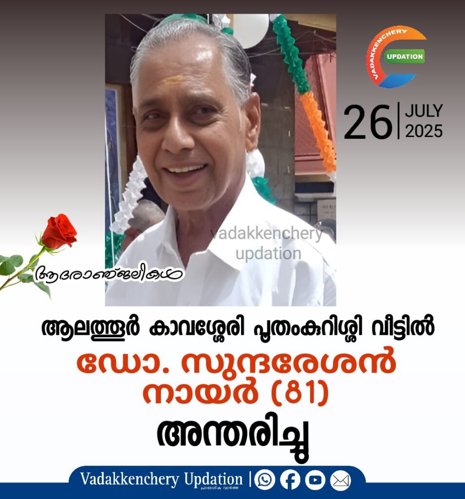 കാവശ്ശേരി പൂതംകുറിശ്ശി വീട്ടിൽ ഡോ. സുന്ദരേശൻ നായർ(81) വെള്ളിയാഴ്ച ബാംഗ്ലൂരിൽ അന്തരിച്ചു.