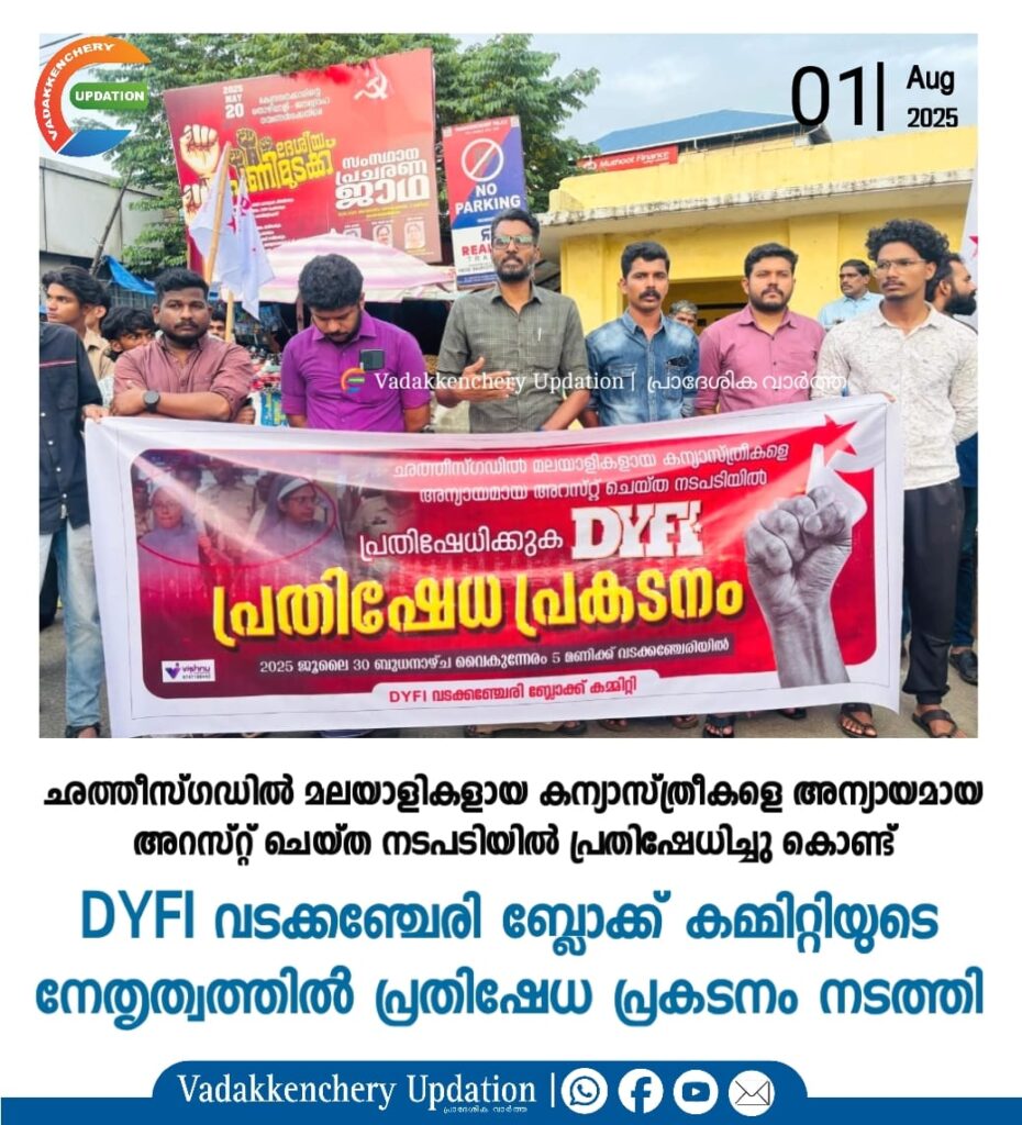 ഛത്തീസ്ഗഡിൽ മലയാളികളായ കന്യാസ്ത്രീകളെ അന്യായമായി അറസ്റ്റ് ചെയ്ത നടപടിയിൽ പ്രതിഷേധിച്ച് DYFI വടക്കഞ്ചേരി ബ്ലോക്ക് കമ്മിറ്റിയുടെ നേതൃത്വത്തിൽ വടക്കഞ്ചേരി ടൗണിൽ സംഘടിപ്പിച്ച പ്രതിഷേധ പ്രകടനം ഷക്കീർ ഉദ്ഘാടനം ചെയ്തു സംസാരിച്ചു. ബ്ലോക്ക് പ്രസിഡന്റ് ആർ നിഖിൽ അദ്ധ്യക്ഷനായി. ബ്ലോക്ക് സെക്രട്ടറി കെ ശ്രീജിത്ത് സ്വാഗതവും ബ്ലോക്ക് ട്രഷറർ യു അഷറഫ് നന്ദിയും പറഞ്ഞു.