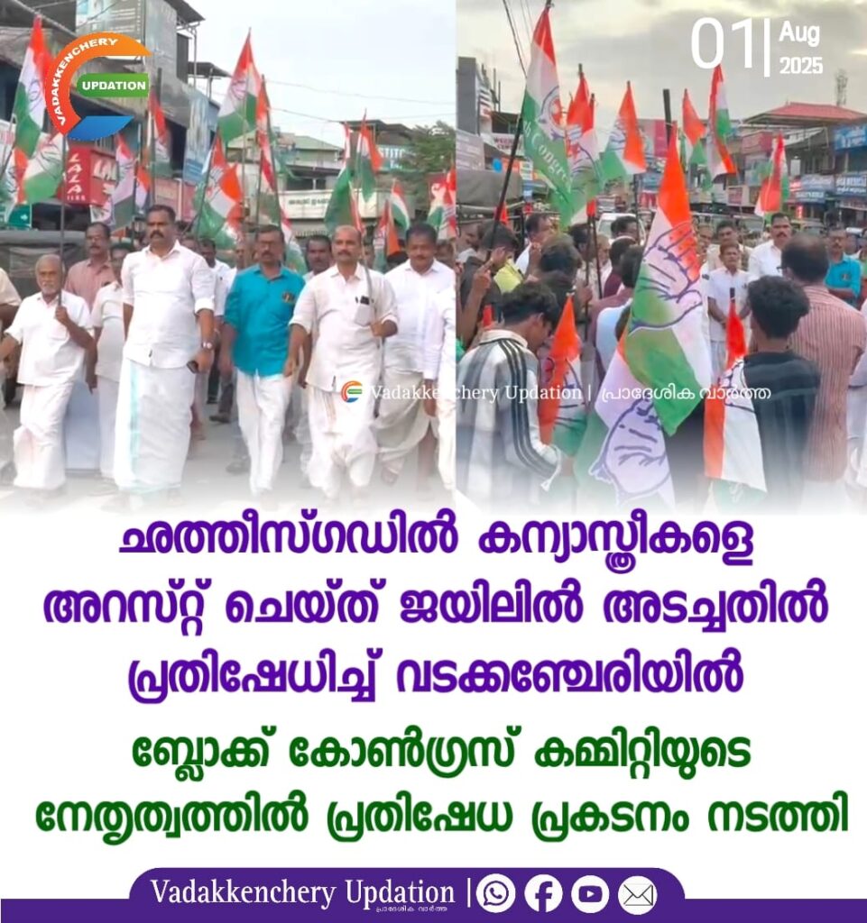 വടക്കഞ്ചേരി ടി ബി പരിസരത്തുനിന്നും ആരംഭിച്ച പ്രതിഷേധ ജാഥ നഗരം ചുറ്റി മന്ദ മൈതാനിയിൽ സമാപിച്ചു. തുടർന്ന് നടന്ന പ്രതിഷേധ പൊതുയോഗം കെപിസിസി അംഗം പാളയം പ്രദീപ് ഉദ്ഘാടനം ചെയ്തു. ബ്ലോക്ക് കോൺഗ്രസ് പ്രസിഡന്റ് അഡ്വക്കേറ്റ് എം ദിലീപ് അധ്യക്ഷനായി. കോൺഗ്രസ് നേതാക്കളായ, ഡോക്ടർ അർസലൻ നിസാം, കാരയങ്കാട്ട് ശിവരാമകൃഷ്ണൻ, എൻ രവി, സുദേവൻ കൊട്ടേക്കാട്, ഉദയൻ കാവശ്ശേരി, ഉദയൻ പുതുക്കോട്, ഇല്യാസ് പടിഞ്ഞാറെക്കളം,റെജി കെ മാത്യു, ബാബു മാധവൻ,എ ഭാസ്കരൻ, വി സജീഷ് കുമാർ,വി എ മൊയ്തു, പി കെ നന്ദകുമാർ എന്നിവർ പ്രസംഗിച്ചു.